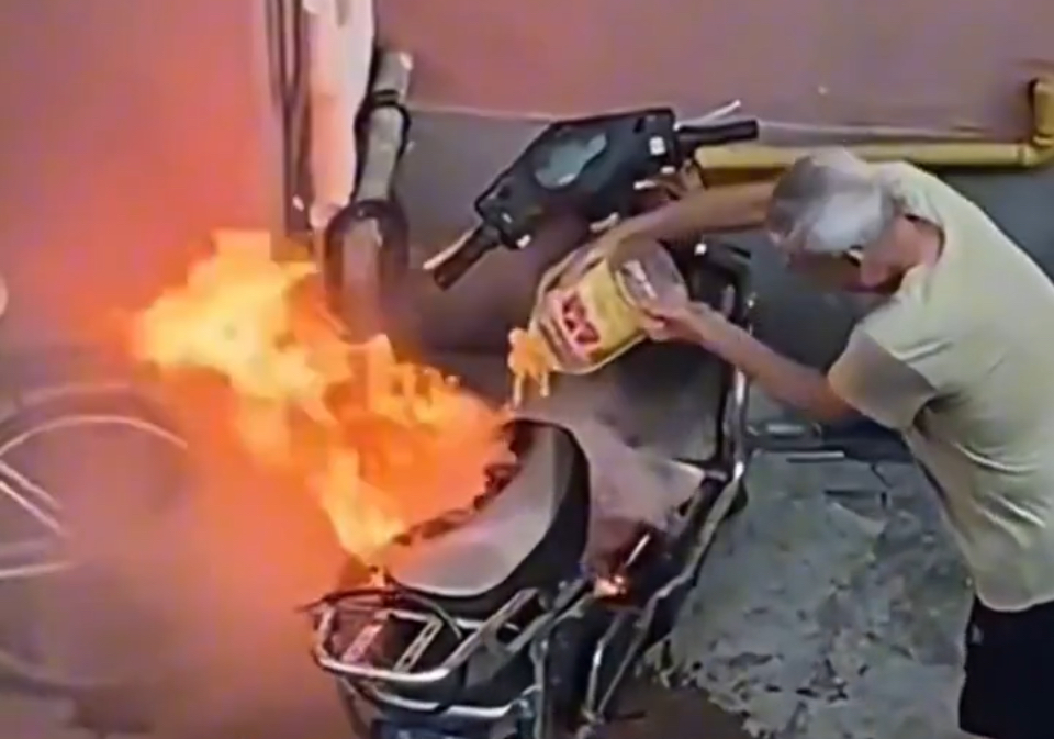 网络热传的老人用食用油桶扑救电动自行车画面(网络图片)