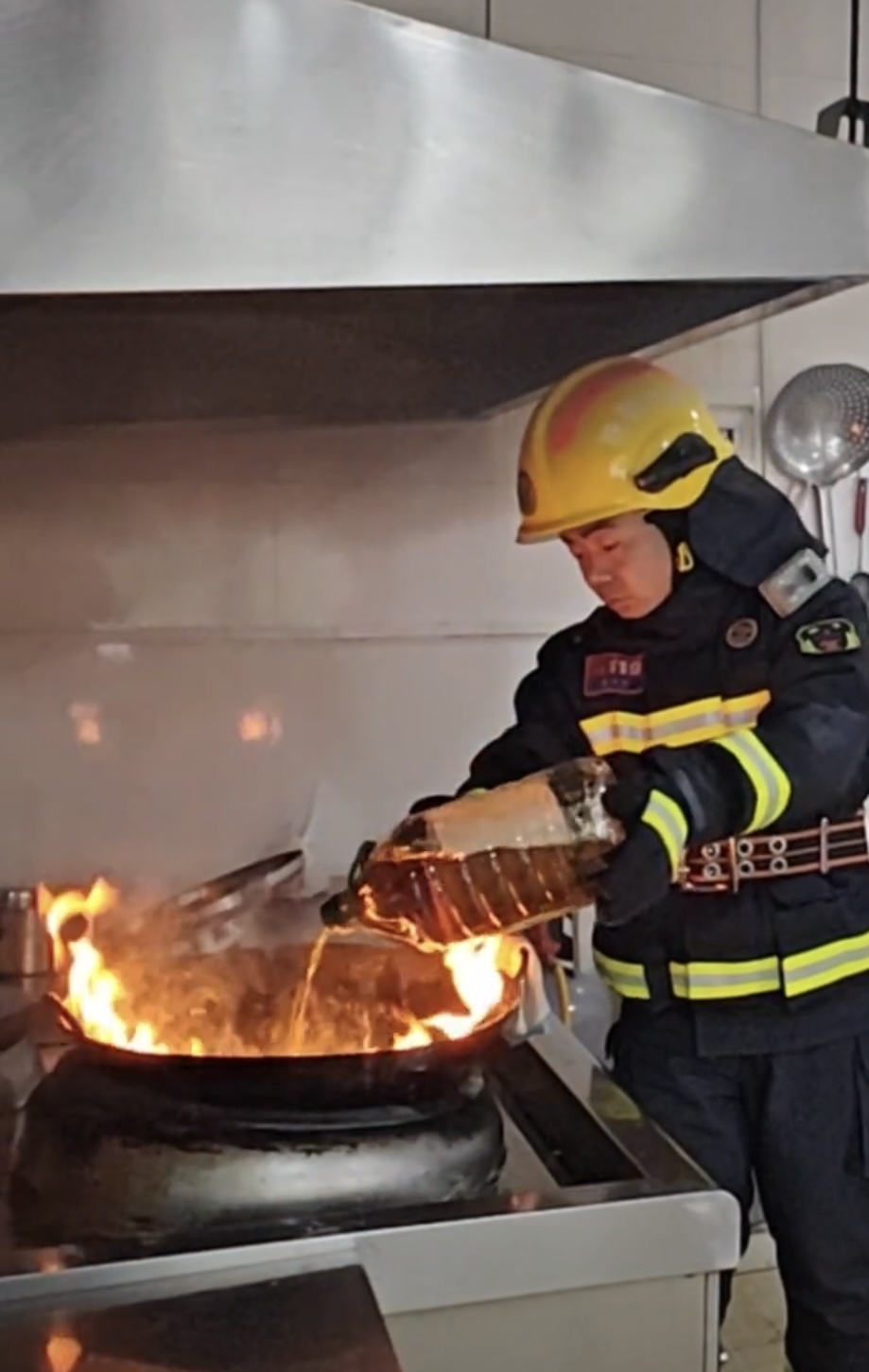 冷油成功扑灭油锅起火(消防实验画面)