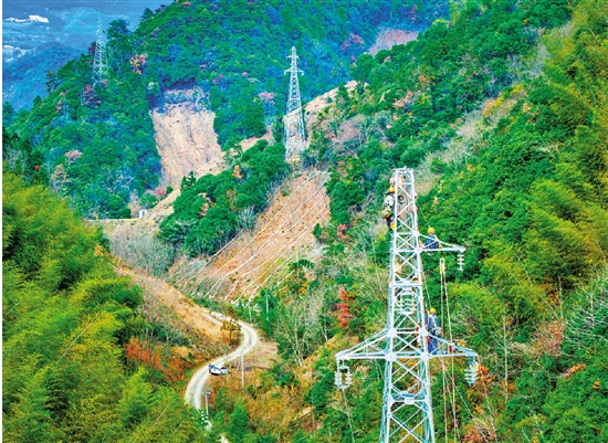 (大有集团工作人员在杭州临安区农网配套送出工程现场有序地进行架线工作,进一步优化杭州地区的电网布局。 贾奇缘 摄)