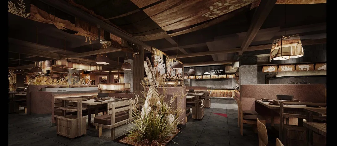 比如,山野风餐厅最重要的元素之一——装修造景,从过去简单地将枯草、假山等布景搬进门店,到如今衍生出融合地域特色或者主打某一类自然场景的山野风。