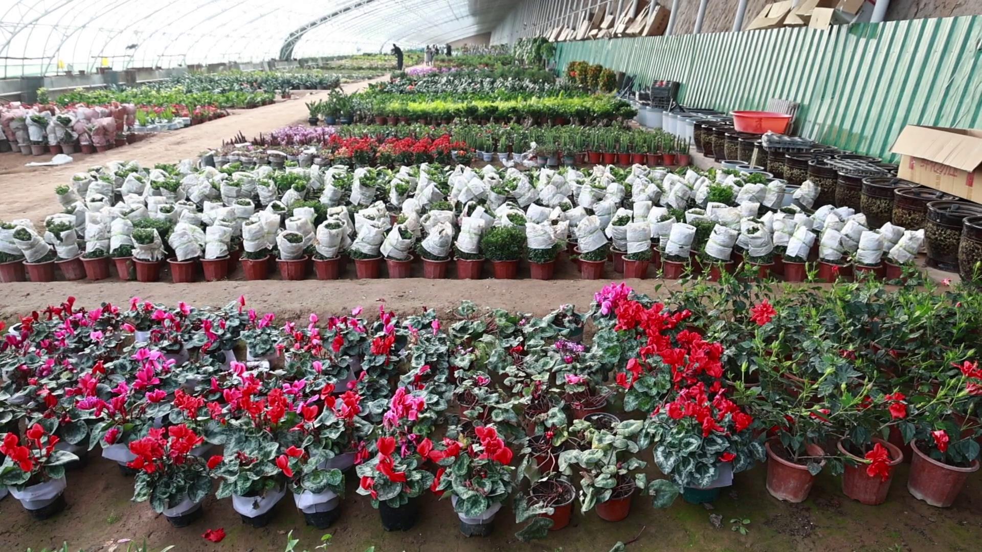 工人们正忙着把刚刚运抵的花卉搬运至大棚内,一盆盆包裹严实的花卉被工人们整齐地摆放在指定位置,为即将到来的销售旺季做好准备。