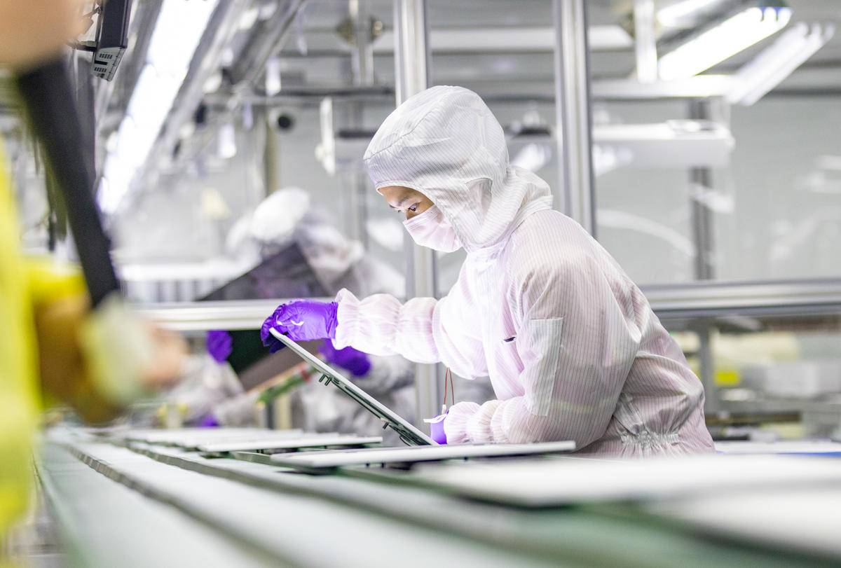 彤辉智能科技天门有限公司LCM无尘车间内,工人们正在加紧安装显示模组。(湖北日报全媒记者 柯皓 摄)