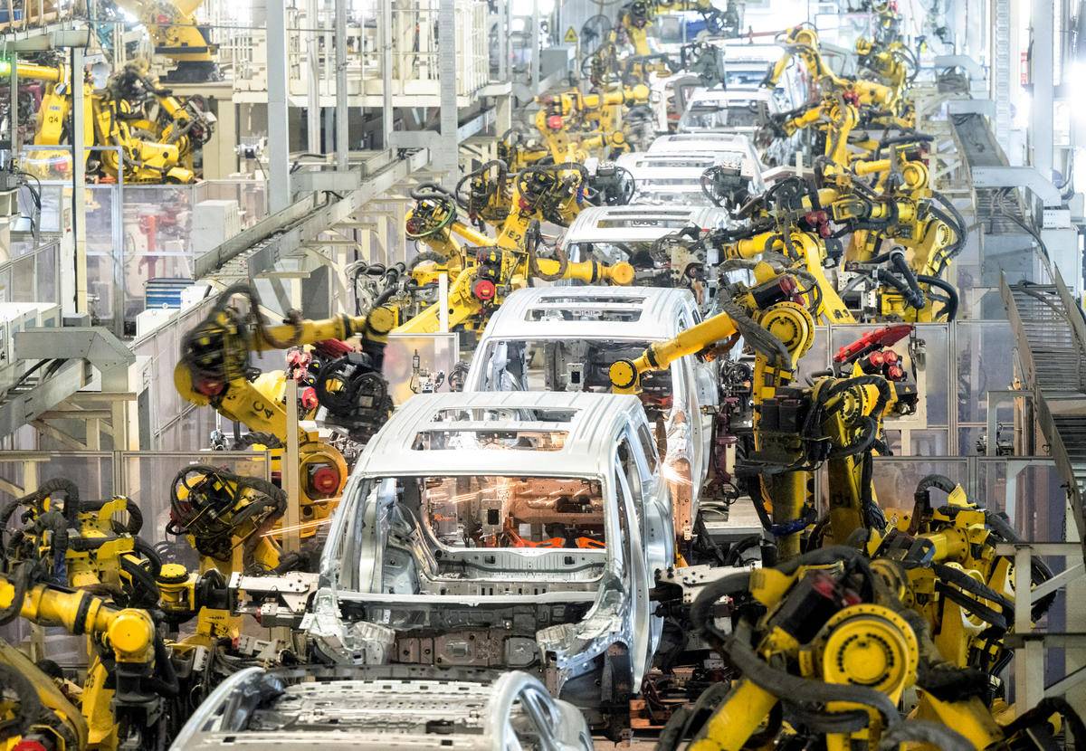 在位于武汉经开区的岚图汽车电动化焊装车间,机器人在流水线上作业。(湖北日报全媒记者 柯皓 摄)