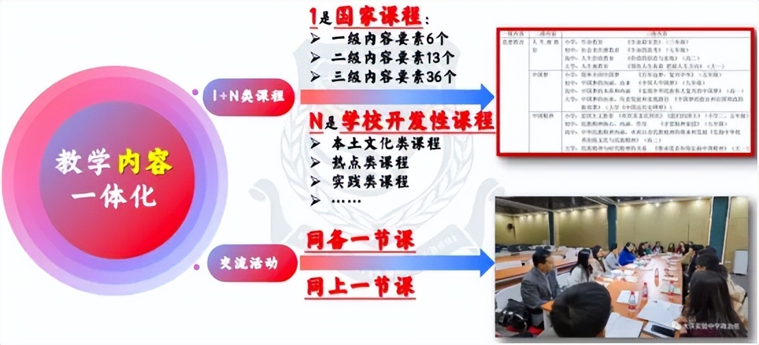 教学内容一体化是大中小学思政课一体化建设的核心任务和关键。学校思政课教师对小学、初中、高中、大学思政课教学内容要素构成进行分学段分析,共梳理出“1+N”类课程(“1”指国家课程,包括一级内容要素6个、二级内容要素13个、三级内容要素36个;“N”指学校开发性课程,包括本土文化类课程、热点类课程、实践类课程等),并与协作校思政课教师举办“同备一节课、同上一节课”等交流活动,依据青少年成长规律和教育梯次原则,针对同一教学内容,探索构建循序渐进、逐步深化的教学体系,共同提高思政课的育人效果。
