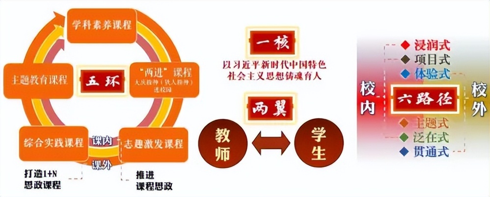 该体系以“一核”(以习近平新时代中国特色社会主义思想铸魂育人)为引领,立足两个主体(教师与学生协同共进),依托五大课程体系(学科素养课程、“两进”课程、志趣激发课程、综合实践课程、主题教育课程)实现认知奠基与价值渗透,通过六种育人路径(浸润式、项目式、体验式、主题式、泛在式、贯通式)形成“环境奠基—思维激活—行为转化—价值升华”的螺旋上升大思政育人格局。