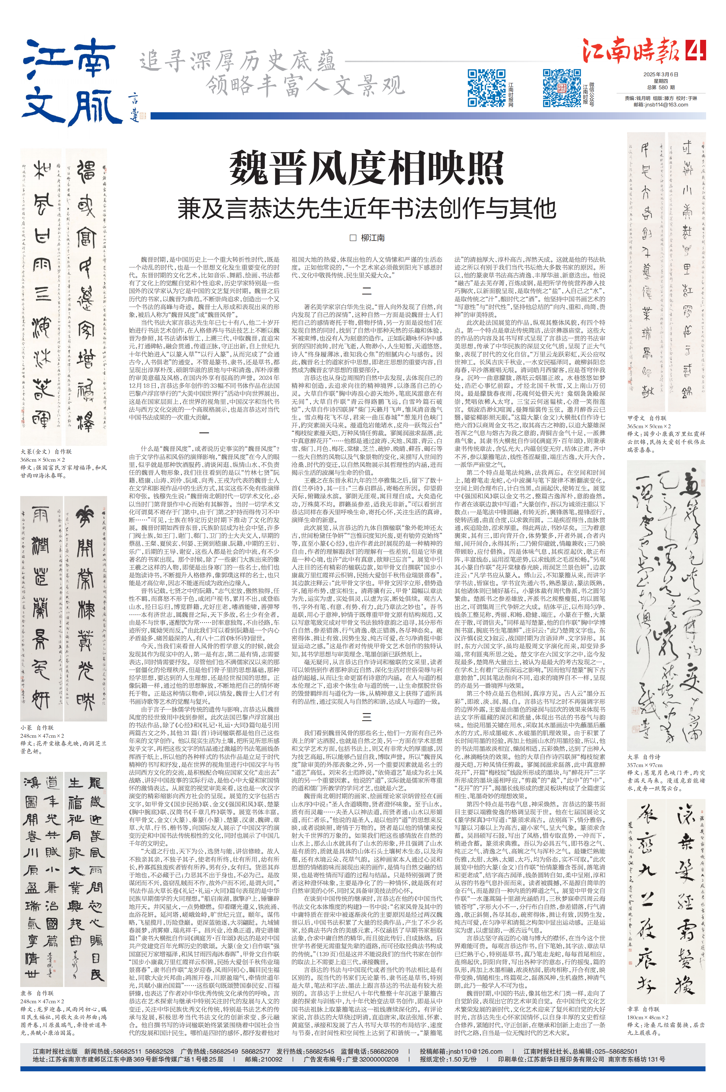 当代书法大家言恭达先生年已七十有八,二十岁开始即进行书法艺术创作,在人格修养与书法技艺上不断以魏晋为参照,其书法诸体皆工,上溯三代,中取魏晋,直追宋元,打通碑帖,融合贯通,传道正脉,守正出新,自上世纪九十年代始进入“以篆入草”“以行入篆”从而完成了“会通古今,人书俱老”的通变。不管是篆书、隶书,还是草书,都呈现出了淳厚朴茂,硕朗华滋的质地与中和清逸、浑朴淳雅的审美意蕴与风格,在国内外享有很高的声誉。2024年12月18日,他多年创作的33幅不同书体作品在法国巴黎卢浮宫举行的“大美中国世界行”活动上向世界展出,无疑是在国家层面上,在世界的视角里贡献中国汉字与当代书法与西方文化交流的一个高规格展示,也是言恭达对当代中国书法成果的一次重大贡献。