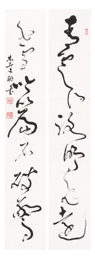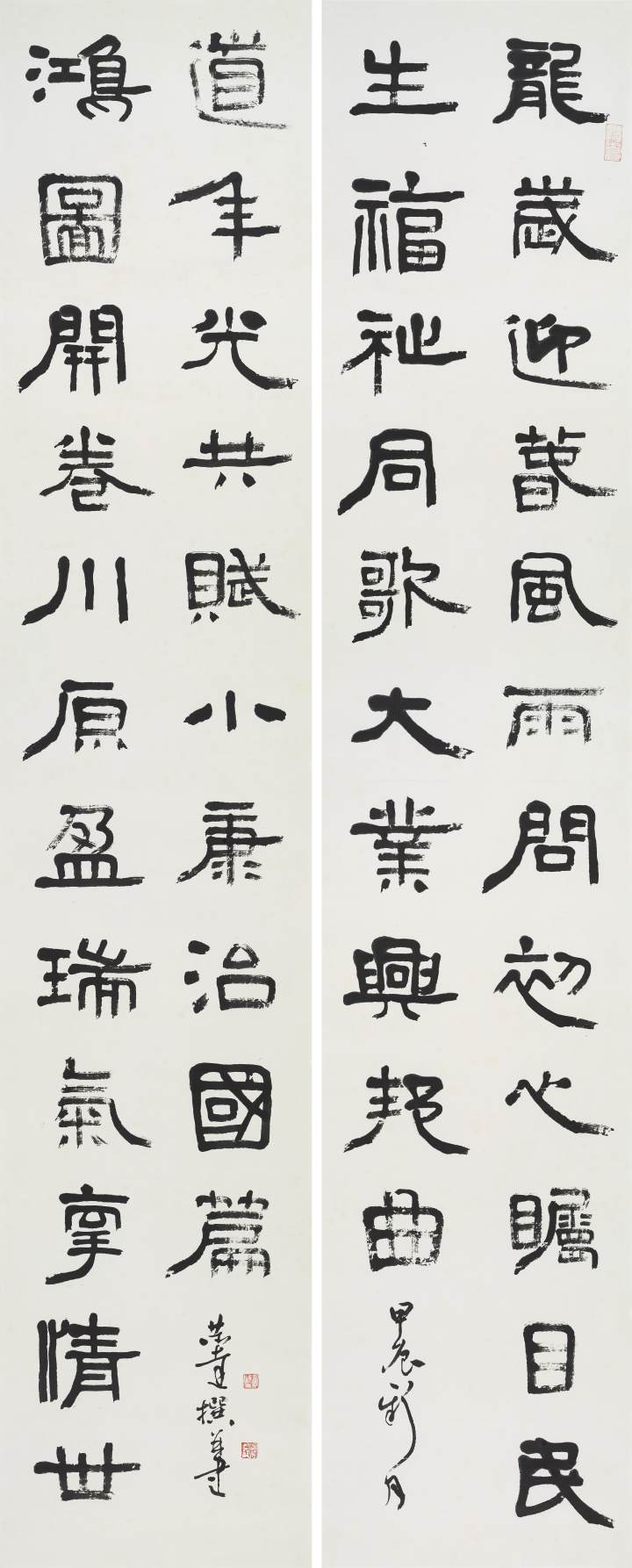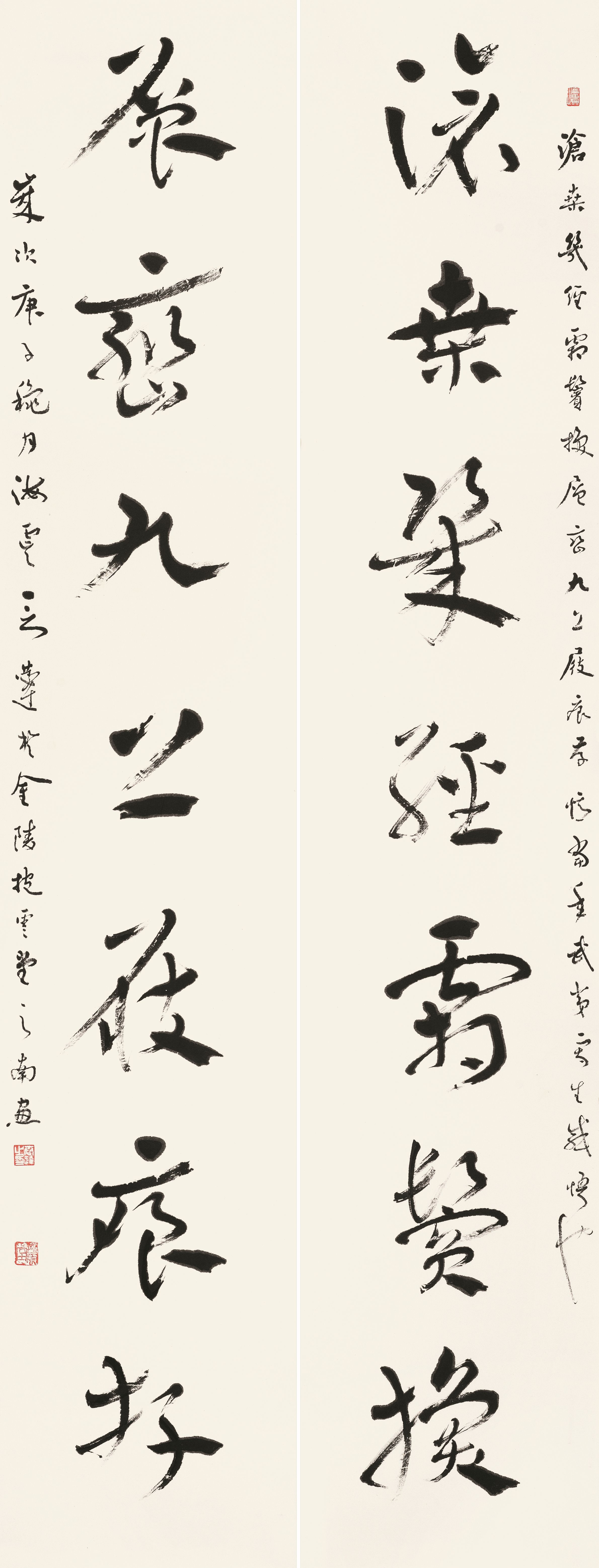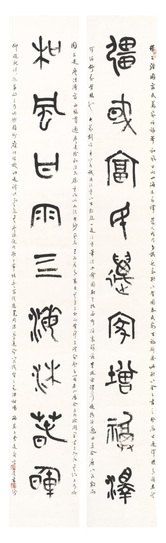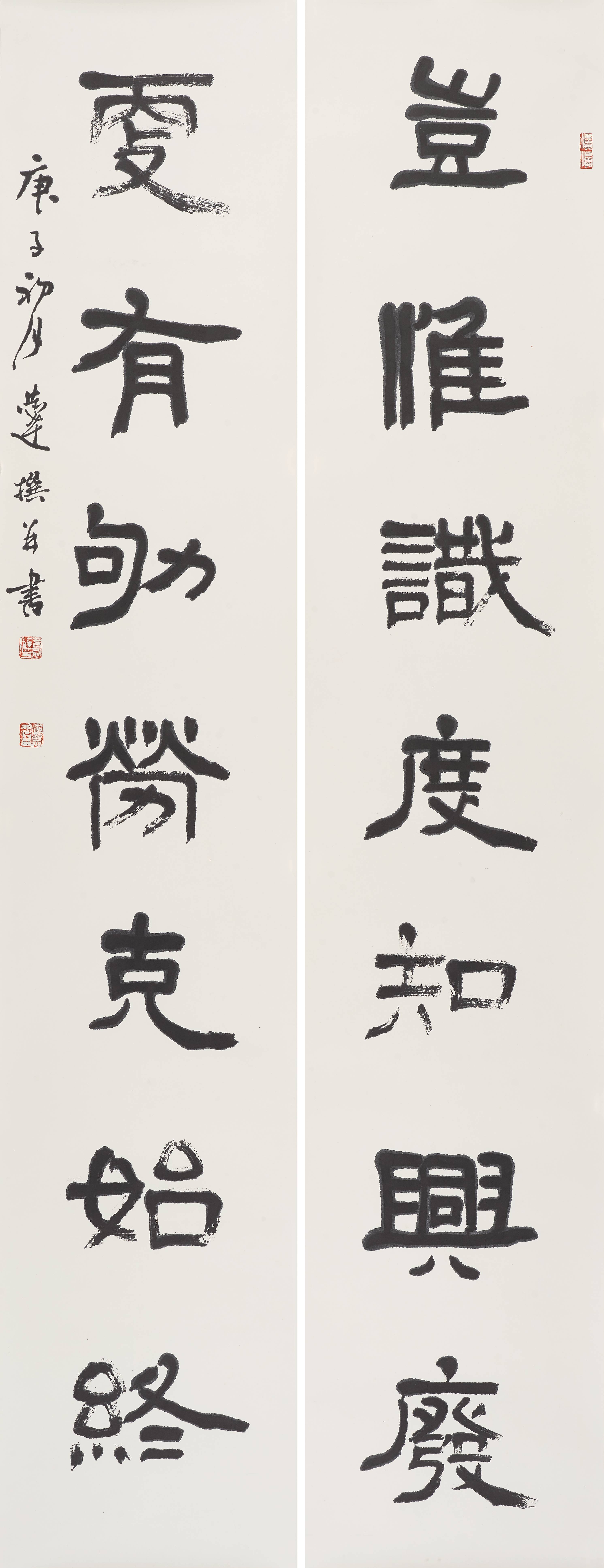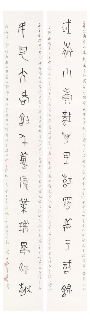 第二个特点是笔法纯熟,法我两忘。在空间和时间上,随着笔走龙蛇,心中波澜与笔下旋律不断翻滚变化。空间上则合理布白,计白当黑,点画起伏,使转互生。展览中《强国和风》楹联以金文书之,整篇古逸浑朴,意韵盎然。作者在该联边款中陈述“大篆创作,须注重一是笔法中锋圆融,有转无折,裹锋落笔,提锋涩行,使转活通,曲直合度,以求敦而圆。二是疾涩得当,血脉贯通,疾追险劲,涩求厚重,得此两法,书妙尽矣。三为着意裹束,其有三,即向背开合,体势繁多,开者外展,合者内缩,间开间合,永得其所。二乃俯仰避就,情趣兼收。三乃映带顾盼,应付借换。四是体味气息,其疾涩起伏,欹正布阵,丰富线态,运用涩笔逆势,以求线质之毛涩松畅。”另观其小篆自作联 :“花开棠棣春光映,雨润芝兰景色妍。”其边款注云:“ 凡学书应从篆入,傅山云,不知篆籀从来,而讲字学书法皆寐也。学书宜先通六书,熟悉篆法,篆法既熟,其他诸体则已铺好基石。小篆体裁有周代派,书之圆匀繁曲。楚派书之参差雄放,齐派书之规整瘦挺,均以圆笔出之,可谓集周三代争妍之大成。结体平正,以布局匀净、线条工整见称,秀丽、和畅、稳健、端庄。小篆在于整,大篆在于散, 可谓信夫。”同样是写楚篆,他的自作联 :“胸中学博图书富,腕底书生笔墨鲜。 ”其注识云:“此乃楚简文字也。东汉许慎《说文》叙云,战国时期为言语异声、文字异形。其时,东方六国文字,虽均是殷周文字演化而来,却变异多端,常有匪夷所思之处。楚文字在六国文字之中,迄今发现最多,楚简帛大量出土,被认为是最大的考古发现之一,在学术上有着广泛而深远之影响。”因而他写楚篆“腕下古意勃勃”,因其笔法指向不同,追求的境界自不一样,而呈现的自是另一番境界与效果。