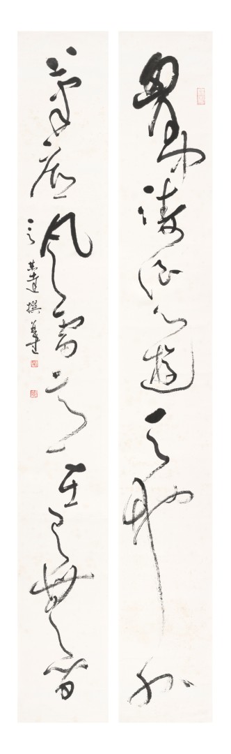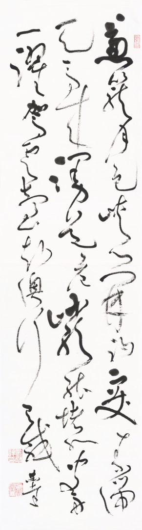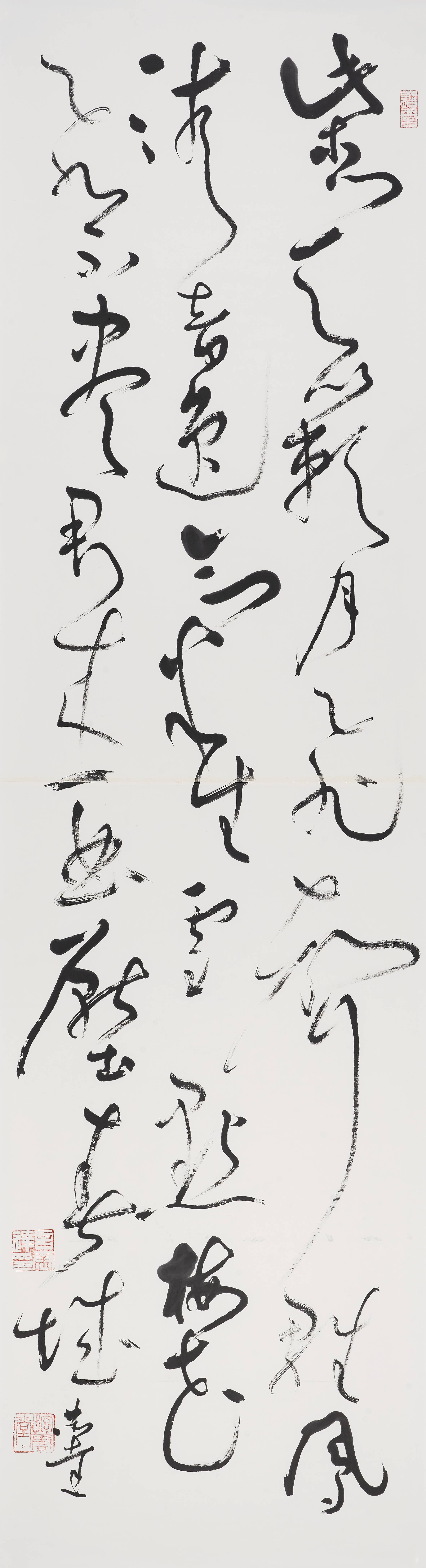 第三个特点是五色相润,真淳方见。古人云墨分五彩,即浓、谈、润、渴、白。言恭达书写之时不再强调字形的边界外露,主要是由墨色的浸润与层次的效果来体现书法文字所蕴藏的深沉和质量,体现出了书法的书卷气与韵味。他说用墨关键在用水,他采取他的水墨画法中先醮墨后醮水的方式,形成墨破水、水破墨的肌理效果。由于积累了长时间用墨的经验,再加上他画山水的用墨经验。所以,他的书法用墨浓淡相宜,燥润相适,五彩焕然,达到了出神入化,淋漓畅快的效果。他的大草自作诗四联屏:“梅枝绽素漫天皑,万种风情任剪裁,寥阒润滋求磊落,此中真意醉花开。”开篇的“梅枝绽”线段所形成的墨块,与“醉花开”三字所形成的墨块遥相呼应,“此中”的“中”,“剪裁”的“裁”,“花开”的“开”的渴墨长线形成的虚灵的板块构成了全篇虚实相生,奇妙的笔墨理想效果。