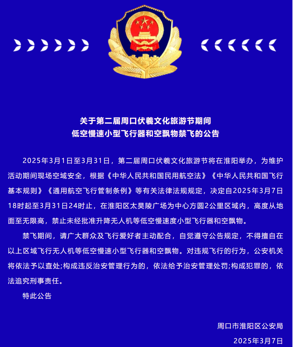 3月7日,淮阳区公安局发布关于第二届周口伏羲文化旅游节期间低空慢速小型飞行器和空飘物禁飞的公告。