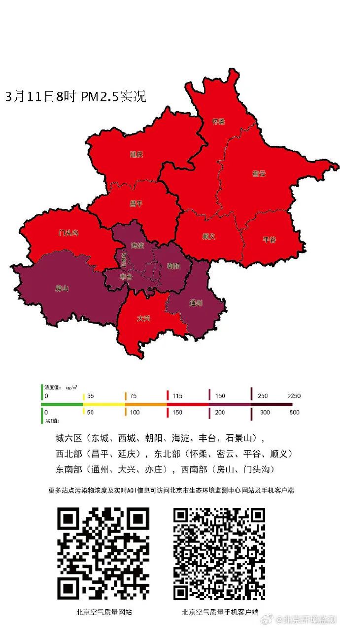 预报显示:今日白天,扩散条件持续不利,空气污染持续;11日晚间京津冀扩散条件好转,PM2.5污染将有所改善。但由于3月10日在蒙古国出现较强沙尘天气,预计将于11日晚间伴随西北风抵达北京市,夜间为沙尘对空气质量影响最明显时段。本次外来沙尘范围大、程度重,从北京过境时间较长,PM10将达到较高浓度水平。
