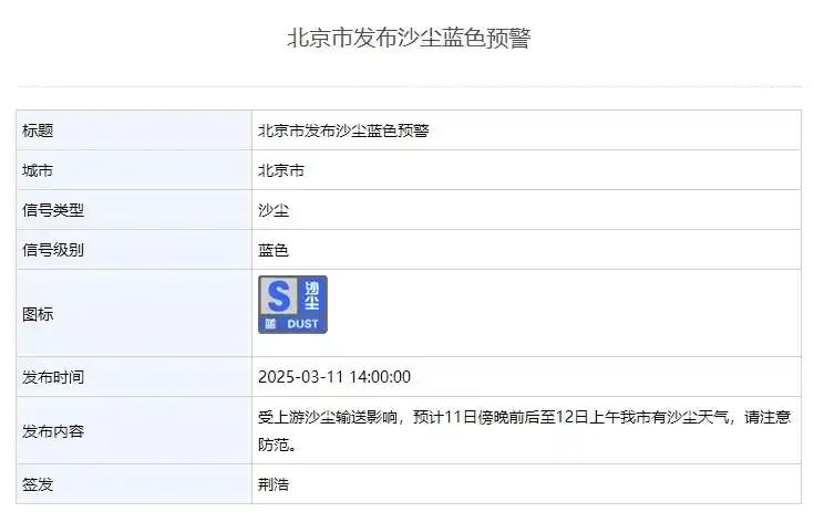 11日14时,北京市气象台发布沙尘蓝色预警信号:受上游沙尘输送影响,预计11日傍晚前后至12日上午本市有沙尘天气,请注意防范。这也是今年北京首个沙尘预警。
