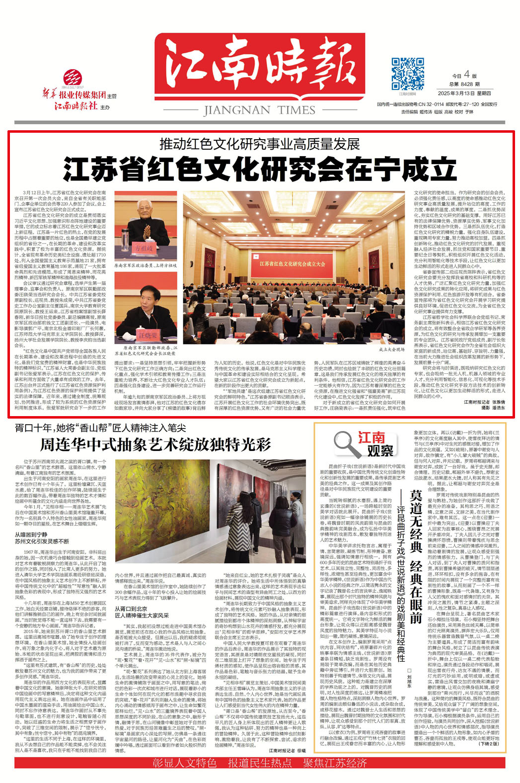 春染金陵万物苏,植树节里播火种。3月12日,江苏省红色文化研究会成立大会在南京召开,省委领导、军地离退休干部代表及专家学者齐聚一堂,以"播种红色基因"为精神内核,在春风化雨中培植红色文化传承的常青之树。这场特殊时点的会议既为全省红色资源保护开发擘画新蓝图,更在时代沃土中深植下赓续精神血脉的信念之根。