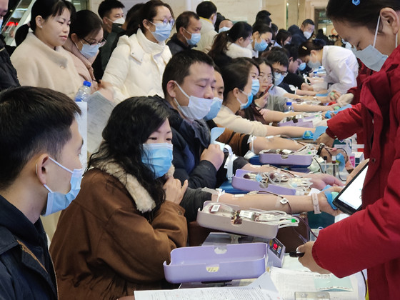 当天上午9时许,记者在献血现场看到,来自卫健系统各单位的献血志愿者们排起了长队,大家在工作人员的悉心指导下,依次进行登记、体检、化验等一系列流程,随后通过符合条件的人员便坐上采血椅,捐献热血,挽救生命。