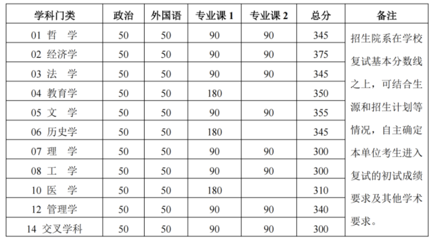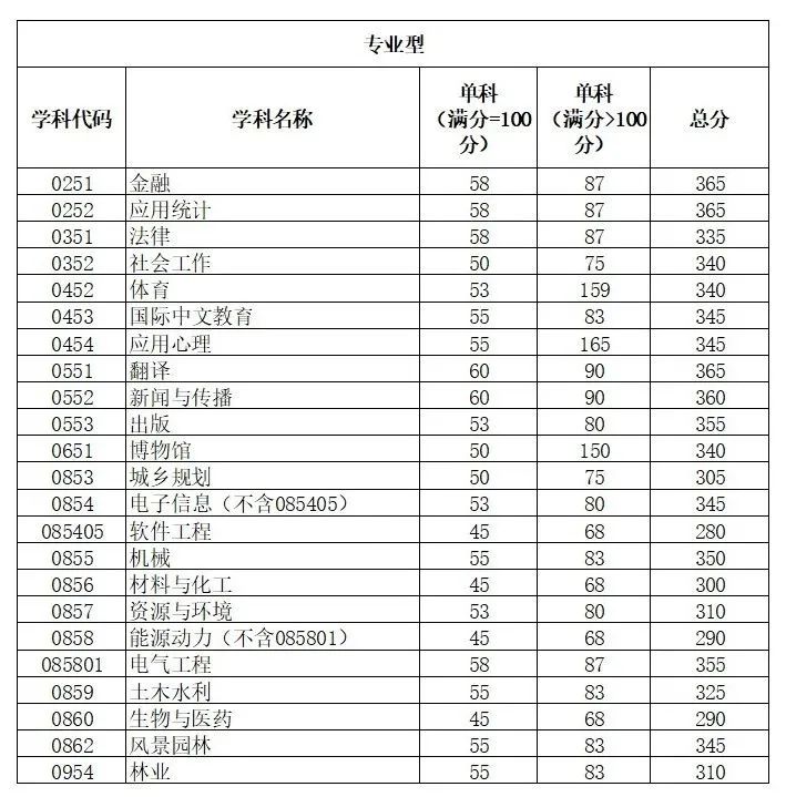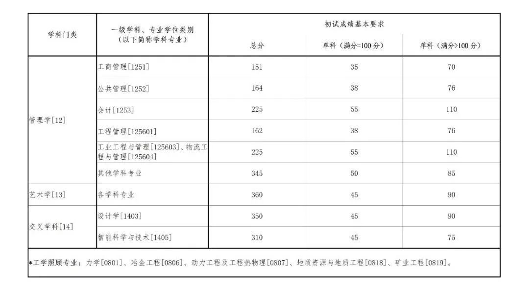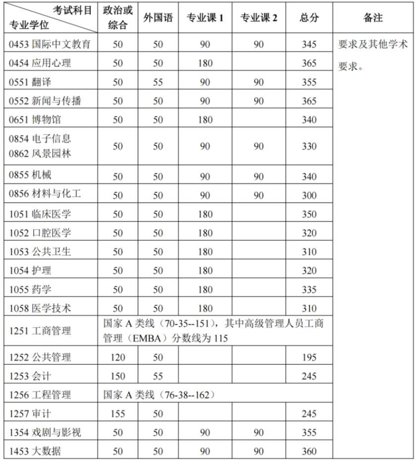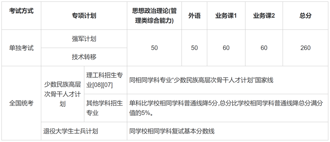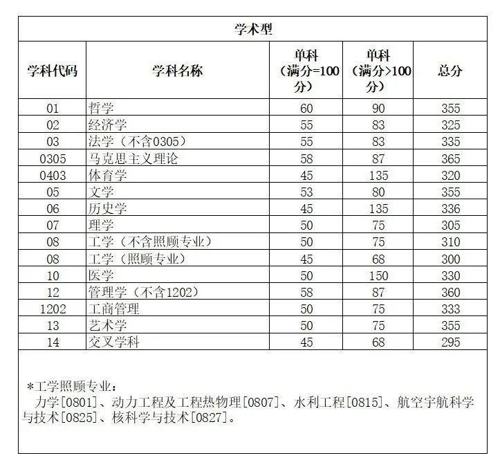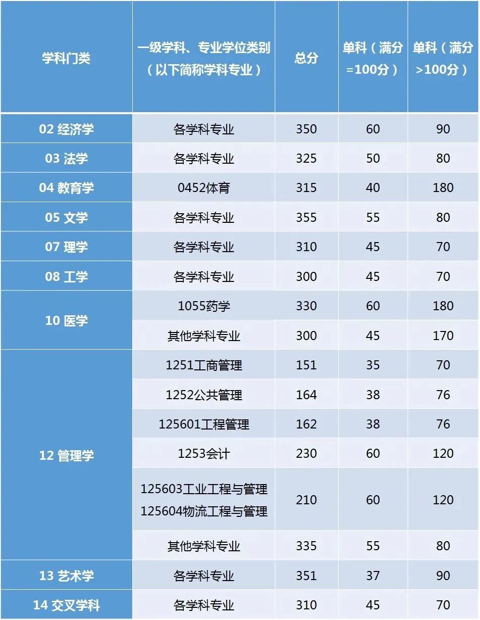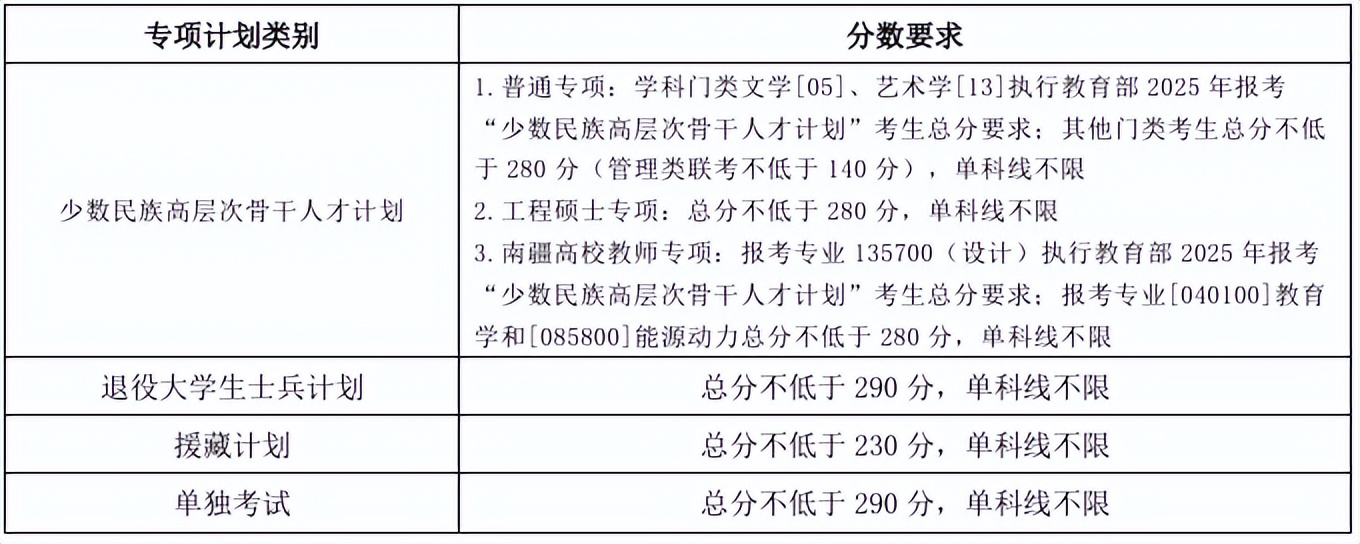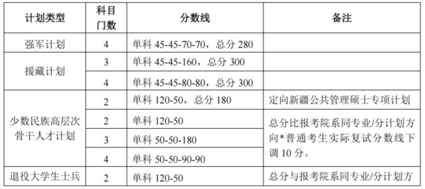 其中面向西藏地区“公共管理人才培养计划”专项,满分100分的单科成绩不低于40分、满分200分的单科成绩不低于90分、总分不低于160分;面向新疆喀什地区医学硕士专项,总分不低于235分,各单科成绩不作要求。