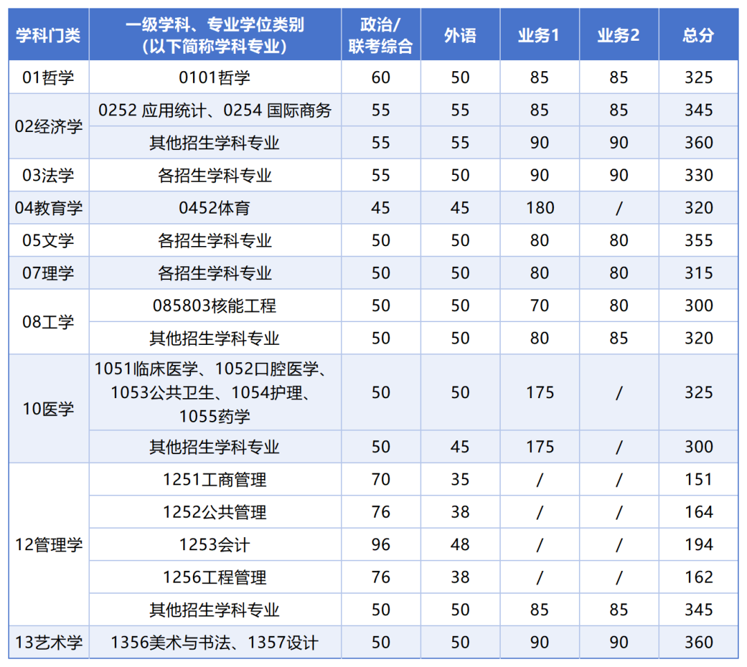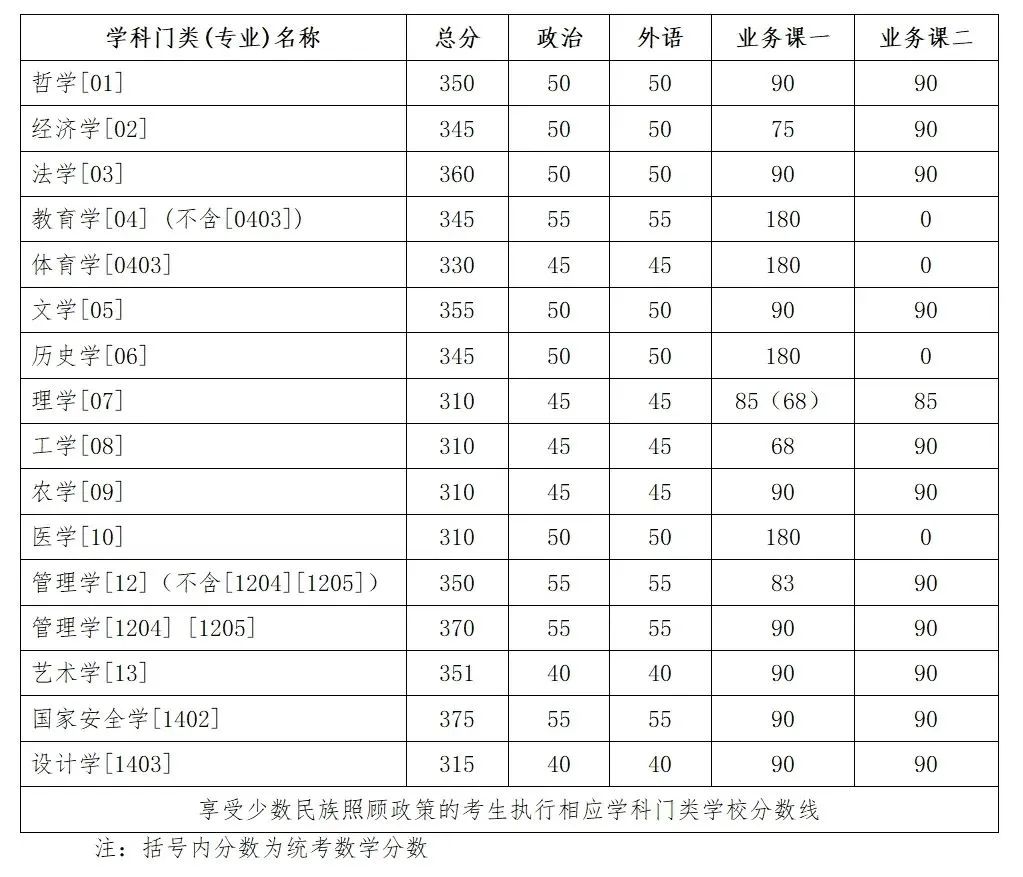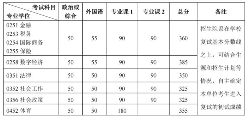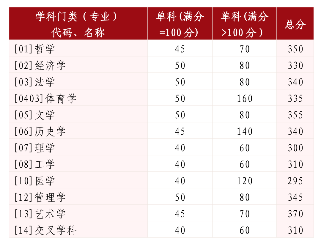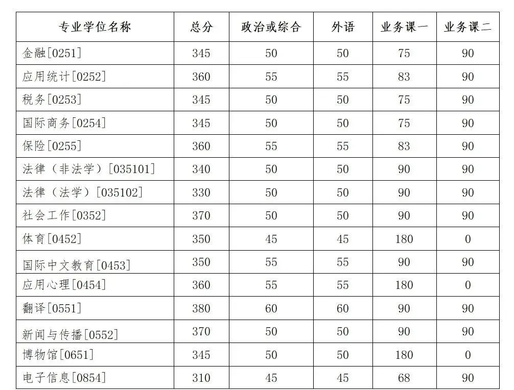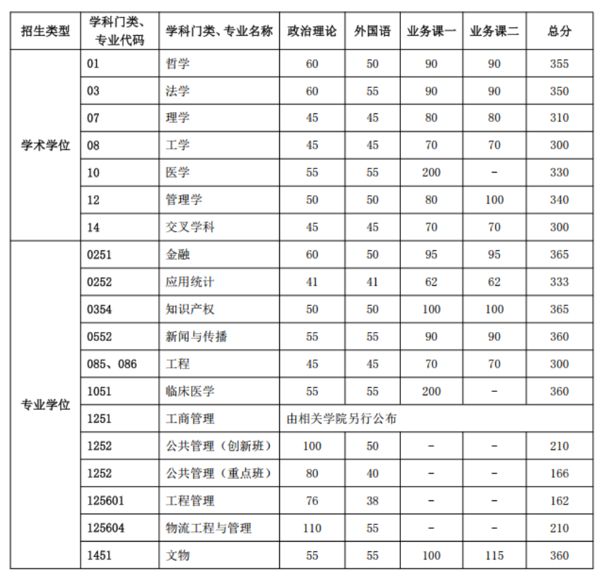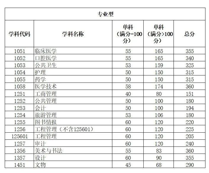 其中面向西藏地区“公共管理人才培养计划”专项,满分100分的单科成绩不低于40分、满分200分的单科成绩不低于90分、总分不低于160分;面向新疆喀什地区医学硕士专项,总分不低于235分,各单科成绩不作要求。