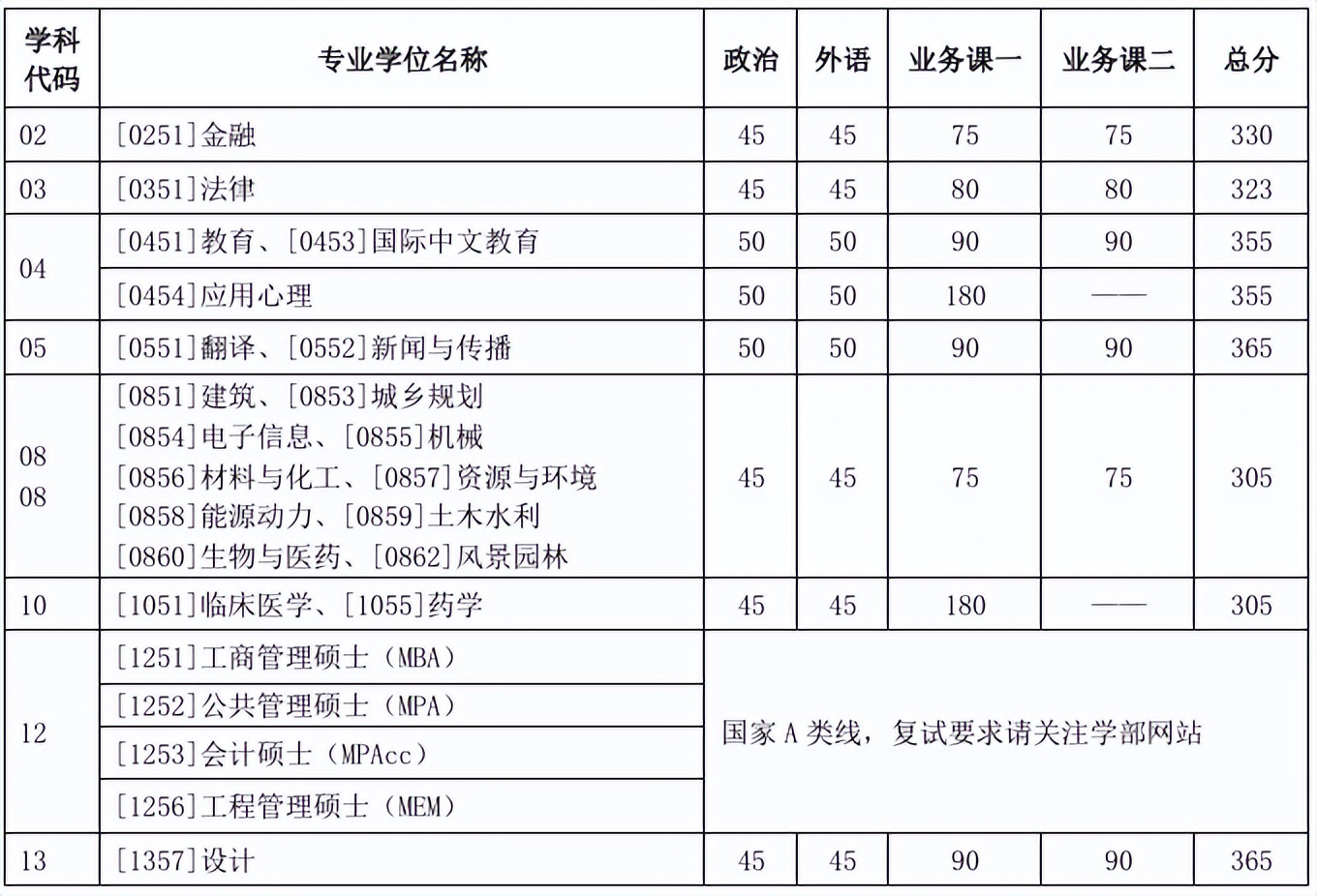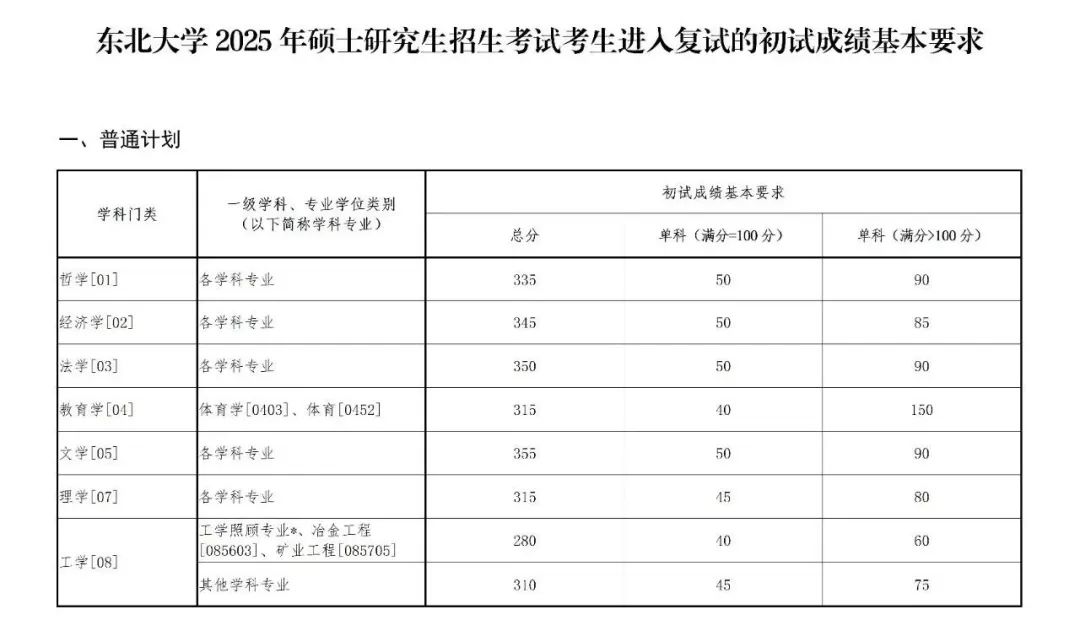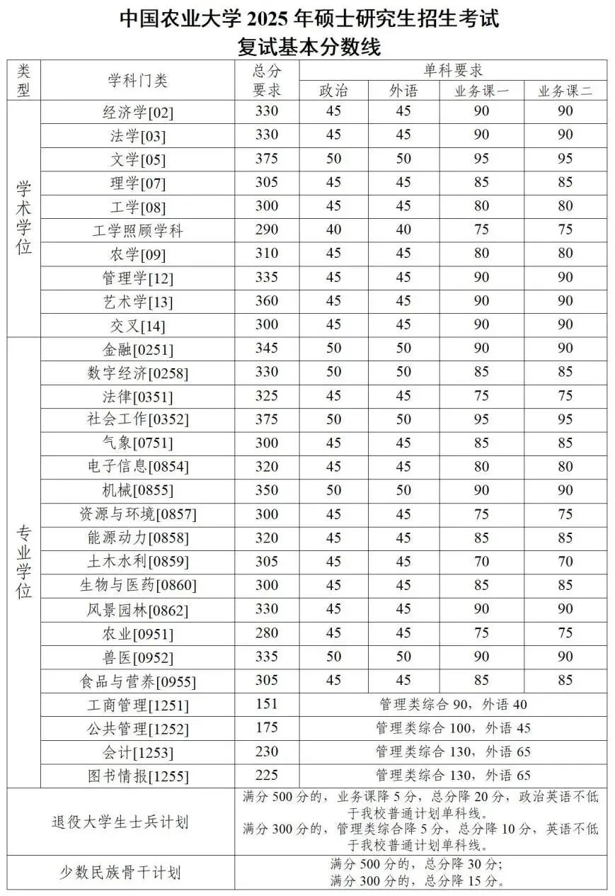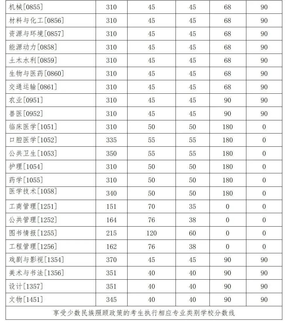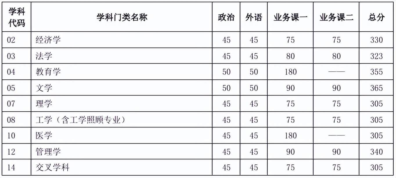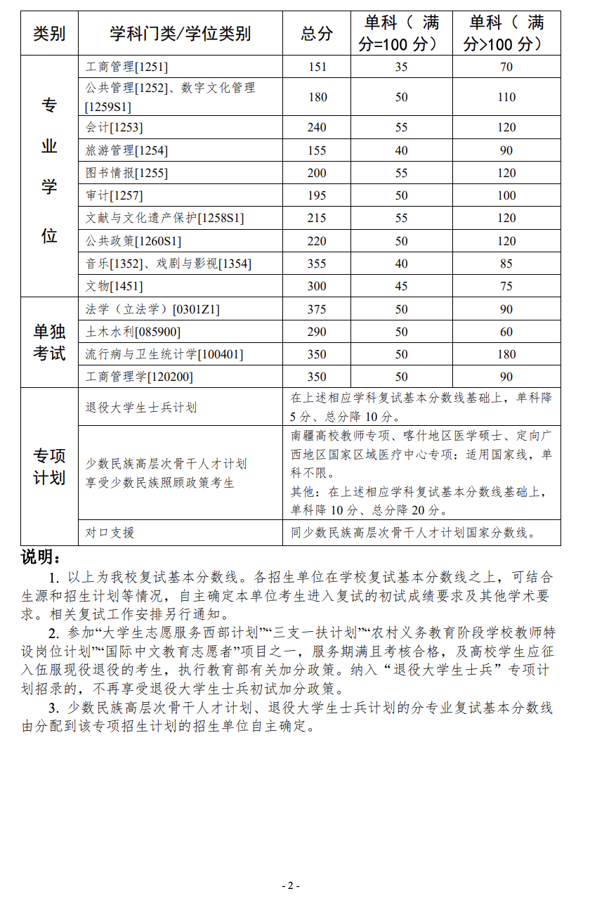 其中面向西藏地区“公共管理人才培养计划”专项,满分100分的单科成绩不低于40分、满分200分的单科成绩不低于90分、总分不低于160分;面向新疆喀什地区医学硕士专项,总分不低于235分,各单科成绩不作要求。