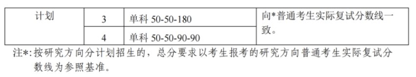 (4)“退役大学生士兵专项硕士研究生招生计划”:按照所报考院系(专业/研究方向)的复试分数线,总分线降10分,单科线不降。