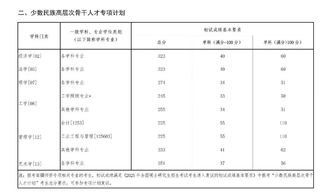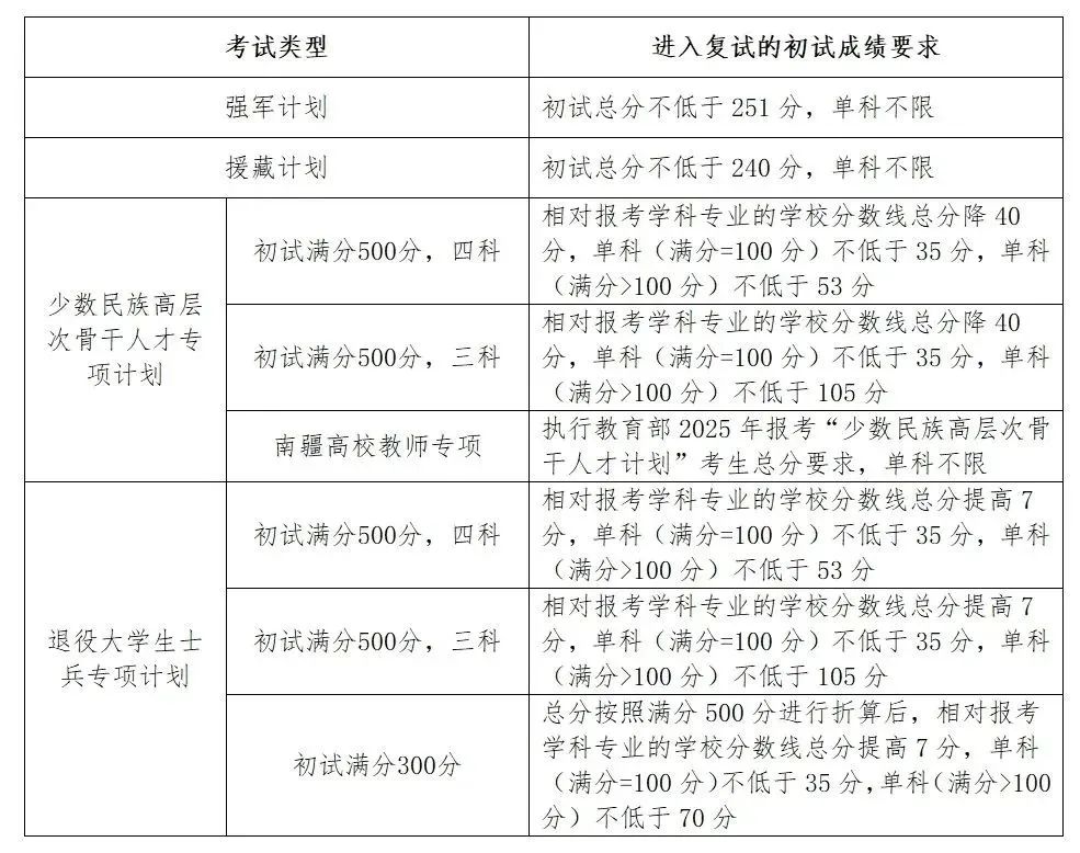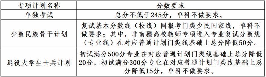 1.“少数民族高层次骨干人才计划(含南疆高校师资专项计划)”:总分不低于所报考学科专业国家少民骨干考生进入复试的初试成绩基本要求;单科成绩不低于所报考学科专业国家A类考生进入复试的初试成绩基本要求。