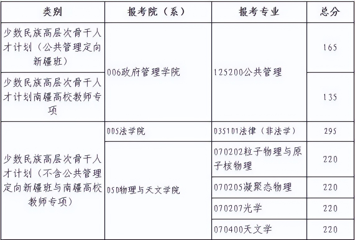 (2)“少数民族高层次骨干人才计划”(不含新疆MPA项目):按照所报考院系(专业/研究方向)的复试分数线,总分线降10分,单科线不降。