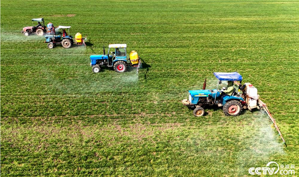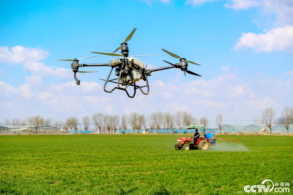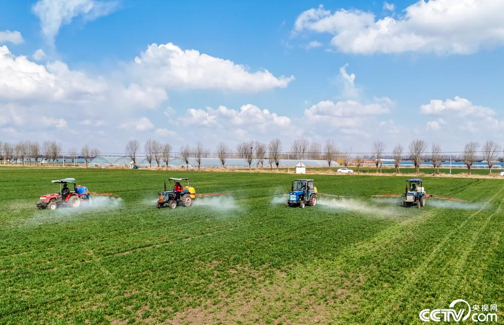 3月16日,在山东青岛莱西市沽河街道,植保无人机、长臂喷雾机在田间对小麦进行管护。