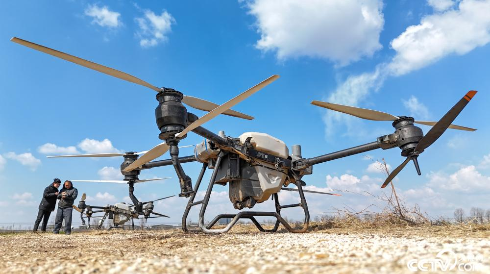 3月16日,在山东青岛莱西市沽河街道,青岛丰诺植保专业合作社的飞手在进行无人机起飞前的准备。
