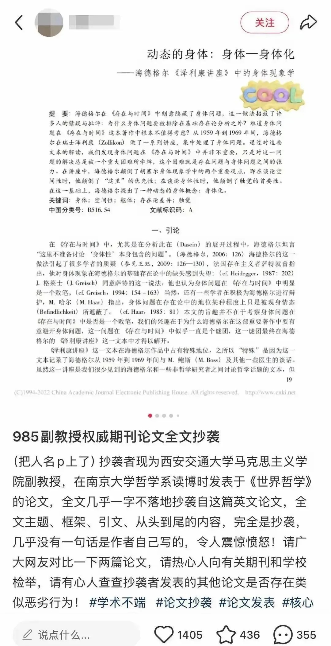 3月12日,一名网友在社交平台发帖,指出王副教授在读博期间的论文涉嫌全文抄袭。该论文发表于《世界哲学》期刊,主题涉及“动态的身体:身体—身体化”。