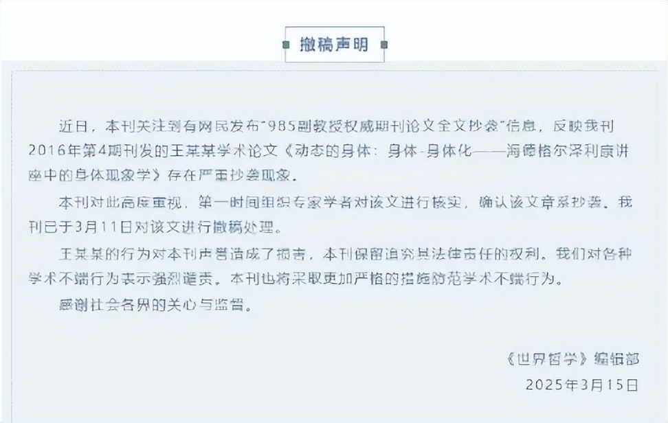 3月15日,《世界哲学》编辑部发布撤稿声明:近日,本刊关注到有网民发布“985副教授权威期刊论文全文抄袭”信息,反映我刊2016年第4期刊发的王某某学术论文《动态的身体:身体-身体化——海德格尔泽利康讲座中的身体现象学》存在严重抄袭现象。