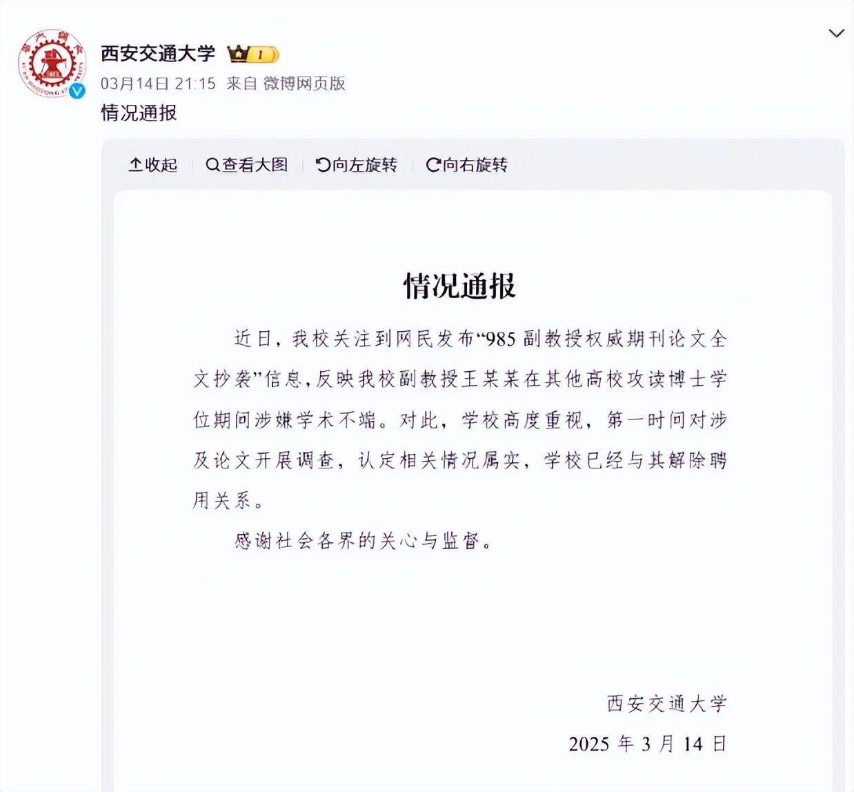 3月14日晚上21点15分,西安交通大学发布情况通报:近日,我校关注到网民发布“985副教授权威期刊论文全文抄袭”信息,反映我校副教授王某某在其他高校攻读博士学位期间涉嫌学术不端。对此,学校高度重视,第一时间对涉及论文开展调查,认定相关情况属实,学校已经与其解除聘用关系。