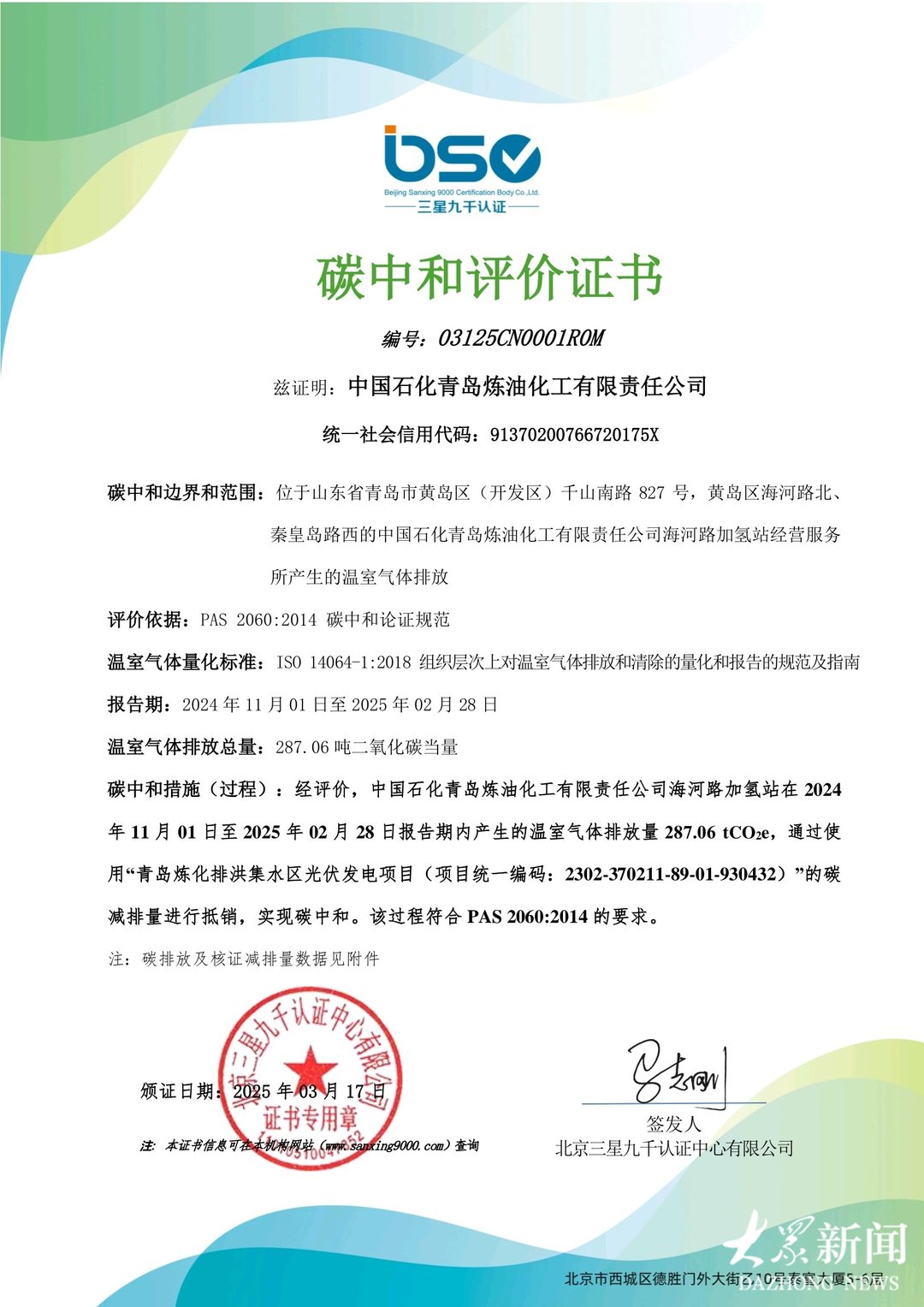 3月17日,中国石化青岛炼油化工有限责任公司海河路加氢站通过权威机构评价,获得“碳中和”证书,成为我国首座“碳中和”加氢站。