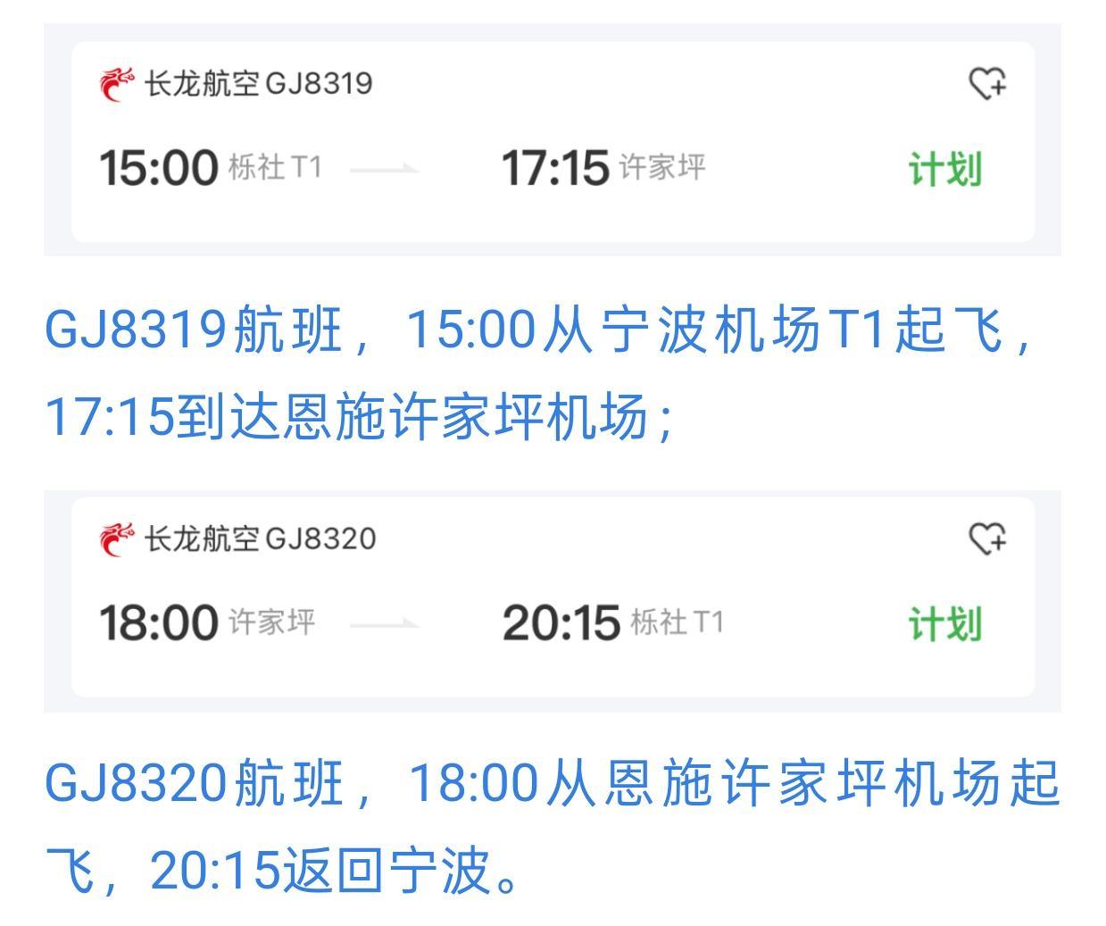 随后,浙江长龙航空有限公司宁波分公司在会上发布最新航班计划,据介绍,随着新航季到来,4月1日起,宁波栎社国际机场将开通直飞恩施许家坪国际机场航线,约2小时即达,“采用空客320机型执飞,计划每周二四六各1班。”