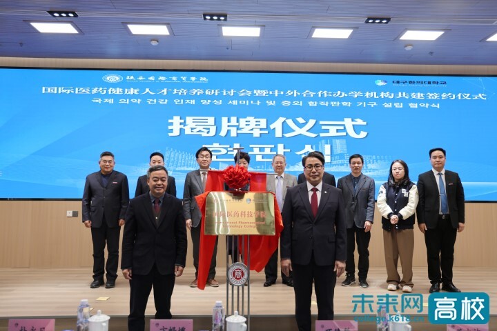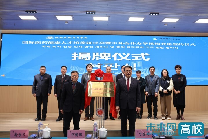 3月18日下午,陕西国际商贸学院与大邱韩医大学举行国际医药健康人才培养研讨会暨中外合作办学机构共建签约仪式。双方先后就传统医学与现代教育融合、健康科学研究、产学研协同育人等议题展开交流研讨,并为“国际医药科技学院”、“国际健康科学学院”揭牌,标志着双方战略合作步入实质性推进阶段。陕西国际商贸学院董事长、校长赵超,董事会领导,全体校领导,大邱韩医大学校长卞暢壎,国际处处长宋志青,国际交流处处长金美贞,国际交流处金镇蓉,大邱韩医大学中国事务所所长董永洁等出席会议。会议由陕西国际商贸学院副校长吴旺延主持。