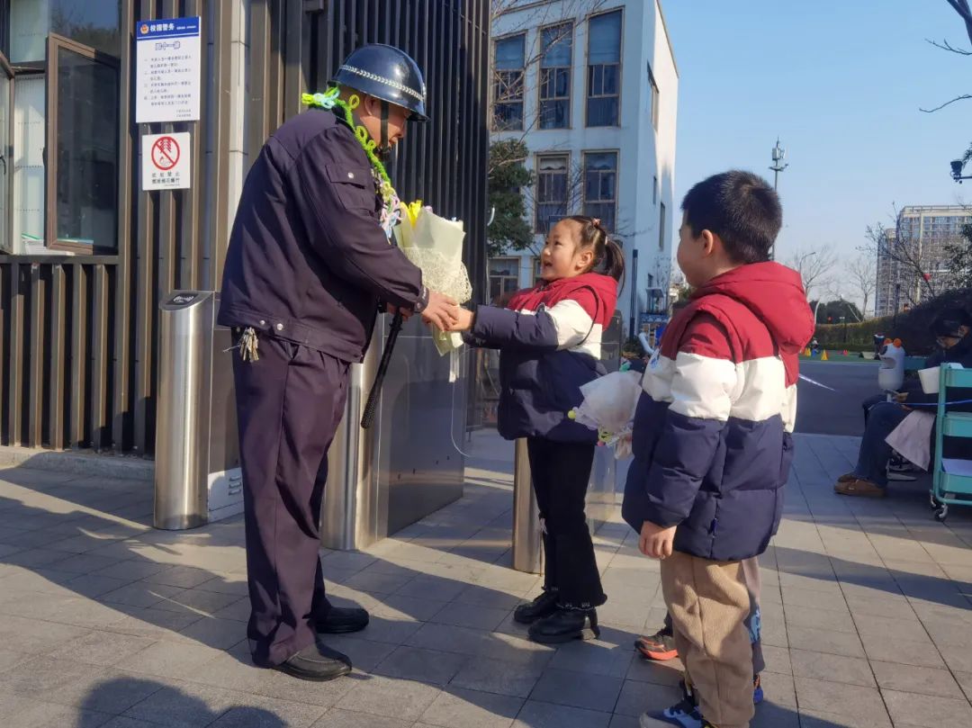 退休当天,最后一班护学岗,幼儿园小朋友给陈国华送花。