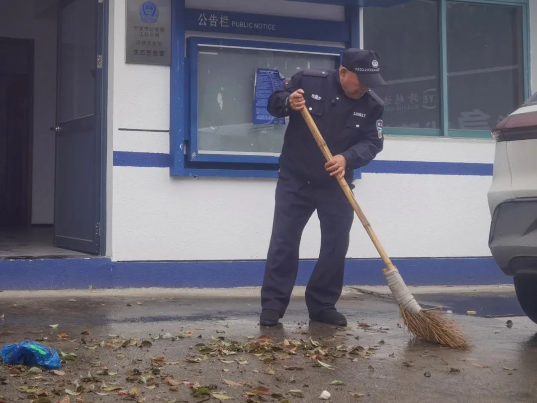 退休前陈国华在警务室门口扫地。