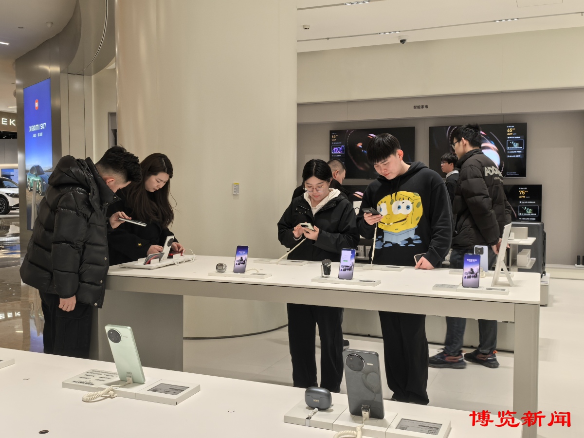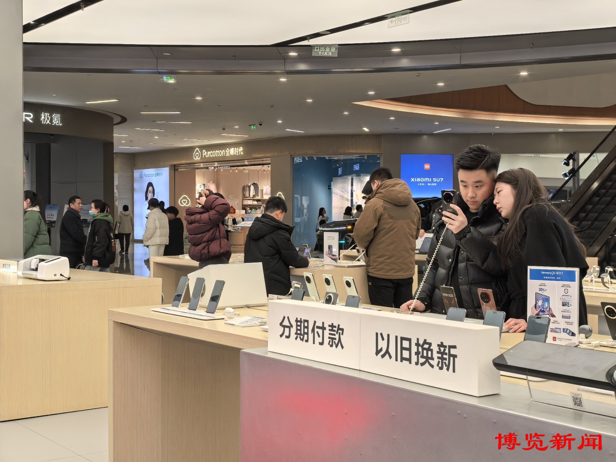 3月19日晚,记者走访位于金晶大道的淄博万象汇发现,尽管是工作日,多家手机门店内依然人头攒动,消费者络绎不绝。在门店醒目位置,“以旧换新”“国补”等字样的宣传牌格外引人注目,吸引了不少消费者驻足咨询。