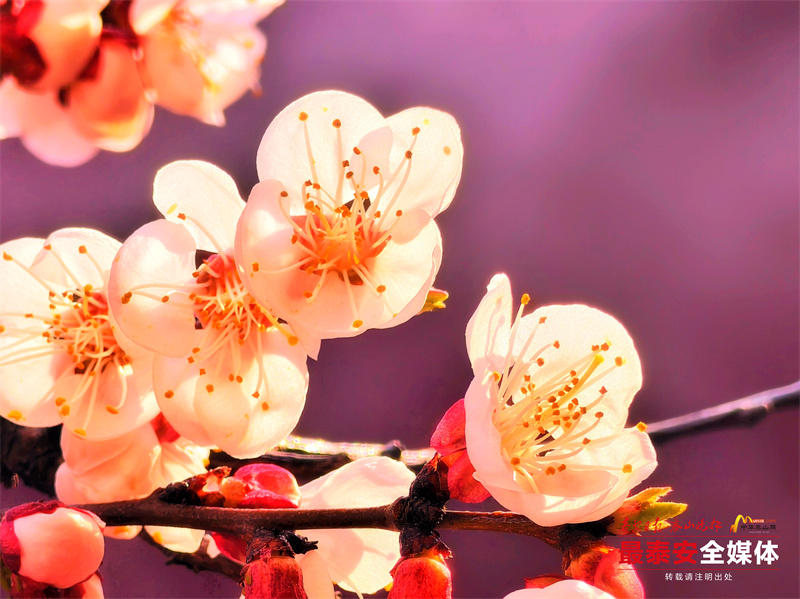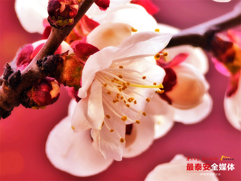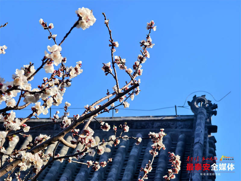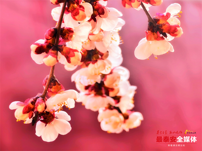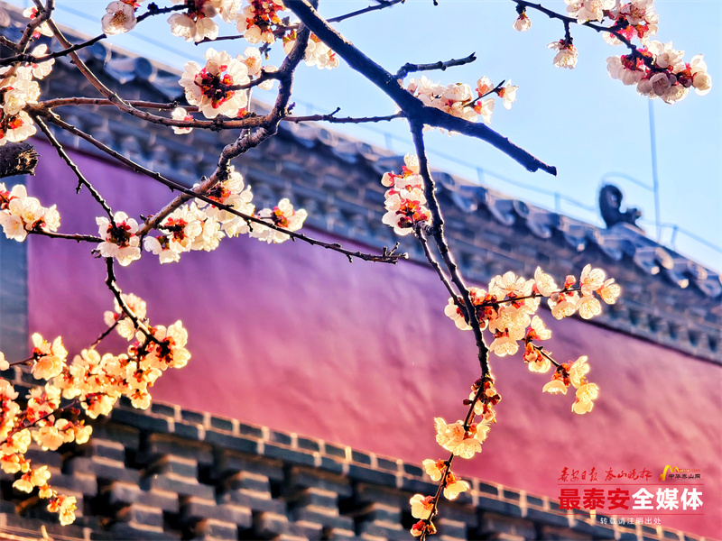 据介绍,红门宫墙外的两株杏树,每年春分前后进入盛花期,花期仅持续10天左右,可谓是泰山限定版美景。游人可站在红门宫飞云阁俯看一树繁花,品味古人“倚朱栏,赏花雪”的意境。