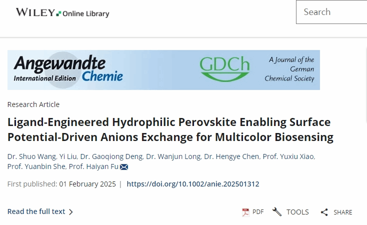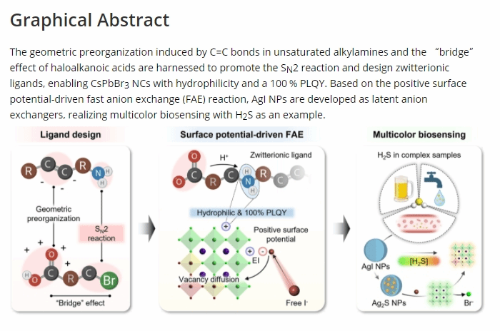 该研究成果以“Liqand-Engineered HydrophiligPerovskite Enabling Surface Potential-Driven Anions Exchange folMulticolor Biosensing”为题发表。受到国家自然科学基金(32122068)、国家重点研发计划(2023YFF1104002)等项目的资助。