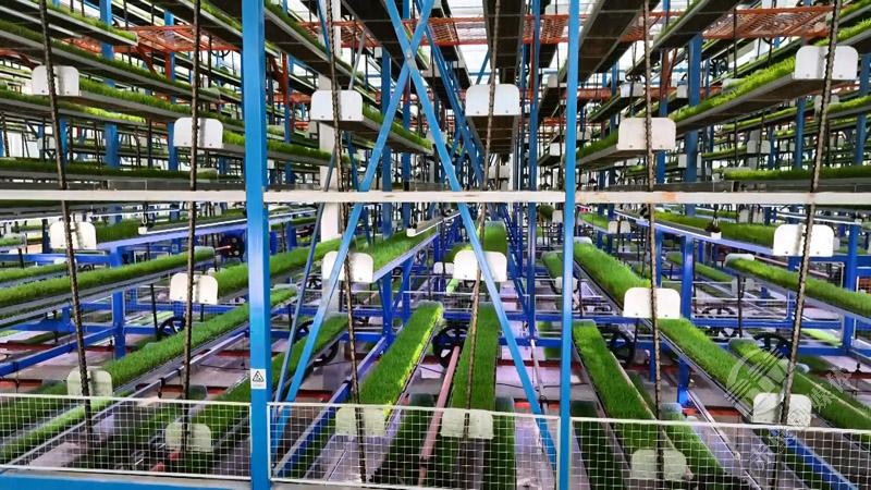 田雁明所说的大棚就是智能化育秧工厂,4条立体循环运动式育秧设备对秧苗进行智能化培育,工人们通过手机APP便能控制厂内的温度、湿度、光照强度以及二氧化碳浓度。育秧配备的自动化喷淋设施可自动喷洒秧苗生长所需的杀菌剂、肥料等。