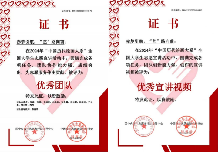 此次“中国历代绘画大系”大学生志愿宣讲团队招募活动面向全国高校遴选1000支团队。经中央青年志愿者行动指导中心、中国青年志愿者协会秘书处严格考核评估,最终仅有100支团队获评“优秀团队”称号。