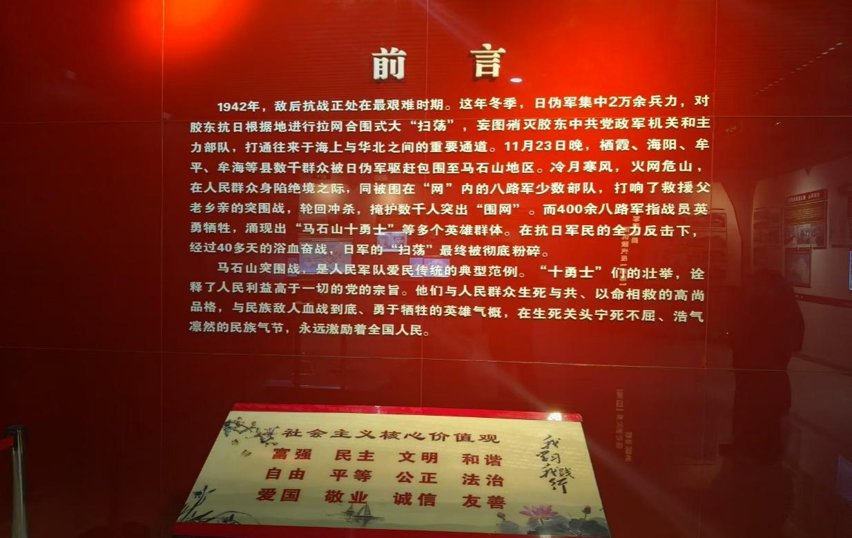 马石山红色教育基地位于乳山市西北部,是胶东地区著名的革命圣地。走进马石山红色教育基地,我仿佛穿越了时空,回到了那个硝烟弥漫的年代。参观过程中,马石山十勇士纪念馆里那一桩桩、一件件展品和照片,无不述说着那段惨烈而又光辉的历史。十名勇士与百倍于己的敌人进行殊死搏斗,最终壮烈牺牲,但他们的精神却永远留在了后人心中。这种视死如归、为国捐躯的大无畏精神,深深触动了我每一个细胞。
