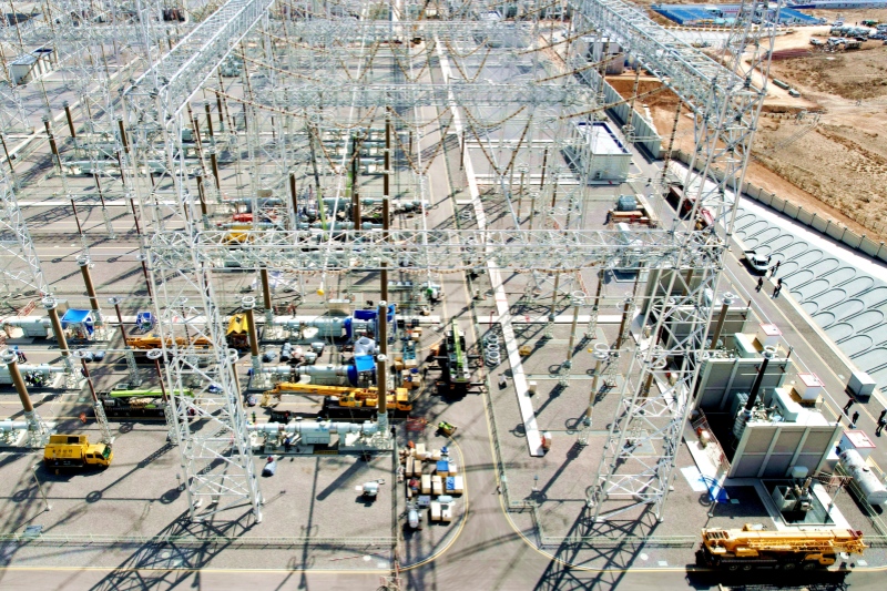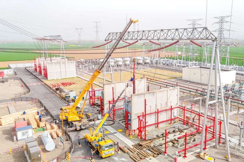 天津送变电公司员工在1000千伏天津南变电站主变压器扩建工程现场检查新装设备。