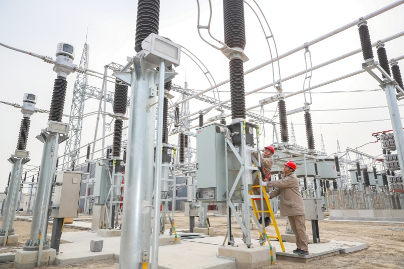 国网河北雄安供电公司员工在复兴220千伏变电站验收组合电器。