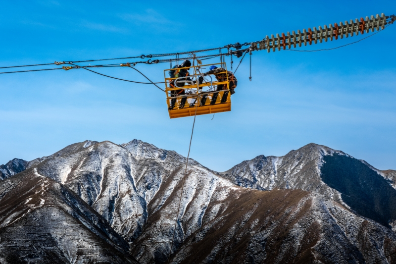 国网甘肃白银供电公司员工在330千伏白芦Ⅰ线进行地线压接等工作。