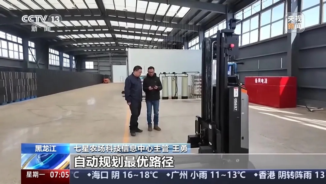七星农场科技信息中心主管 王勇:这款运输机器人搭载了激光雷达自动驾驶技术,能够精准地识别托盘位置,自动规划最优的路径,实现毫米级的堆叠作业。