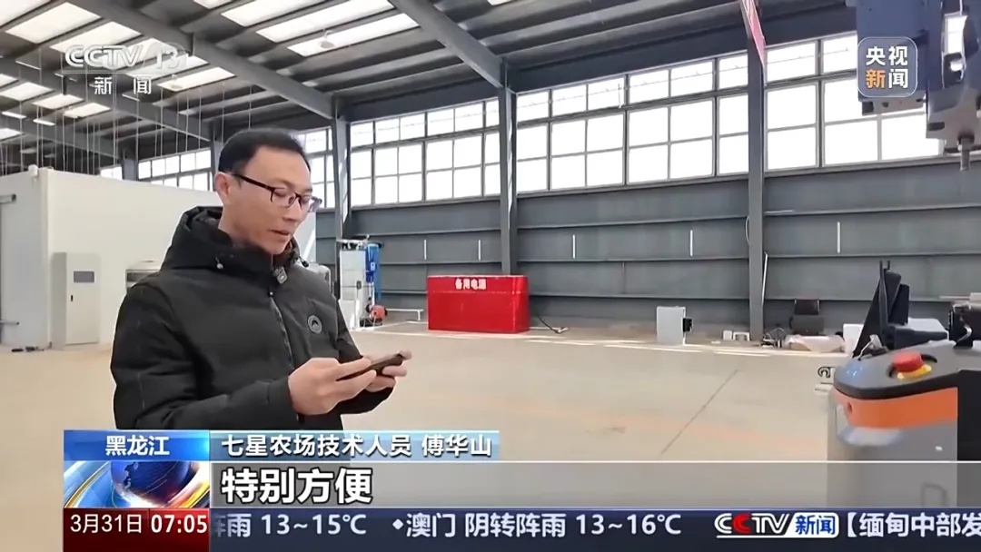 七星农场技术人员 傅华山:手机也能操作,我这边设定好路线,一按,机器人就自动运行了,特别方便。
