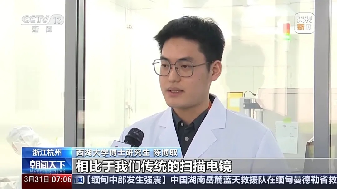 西湖大学博士研究生 陈博取:相比于我们传统的扫描电镜,我们只有一束电子束去做扫描,但是(用)新的这一台多束扫描电镜,扫一幅图的时间从原来的1个小时缩短到了5分钟。