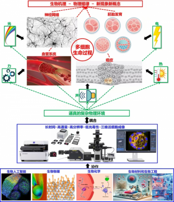 复杂物理环境下的多细胞生命过程,这是实验室的建设重点,李博教授带领团队力求对这些和人民生命健康息息相关的生物过程给出基础科学层面的新见解,并提出一种细胞生物学研究的新范式,以应对生命系统在各个时空尺度上巨大的复杂性。在逼真物理环境下,利用活细胞成像手段研究多细胞生命过程,与分子层面亚细胞尺度的经典分子生物学和生物化学研究形成了有效互补。团队构建了高质量的活细胞成像平台、环境控制系统、细胞培养体系,对癌症的发生发展展开了一系列的研究,发现缺氧环境通过改变细胞的动力学特征大幅加速了早期的肿瘤发生,为肿瘤的早发现、早干预提供了新的策略;利用微流控和微加工技术,构建了流动状态下的血管内皮和癌细胞共培养体系,发现血管几何特征、网络结构对循环癌细胞归巢效率具有重要影响;通过在软细胞外基质上连续传代的方式,成功驱动上皮细胞向癌细胞表型转变,记录到细胞群体性进化的动态过程。这些研究体系性地揭示了肿瘤、癌症各个阶段的动态过程,为基础科学层面理解癌症提供了重要实验依据。在神经系统领域,对活体转基因斑马鱼胚胎的神经细胞进行长时间成像,首次记录了其中枢、眼部以及脊髓部位神经网络的发育过程,为理解智力、视觉和运动能力的建立机制提供跨尺度的实验依据。通过与医院合作,已建立培养和成像体系,探究人类胚胎着床过程的生物物理规律。