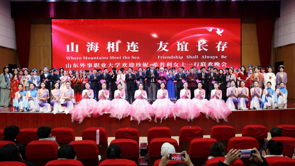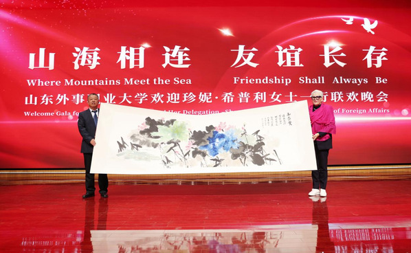 为欢迎珍妮·希普利一行,学校在图书馆报告厅举办了“山海相连 友谊长存”联欢晚会。校长孙承武向珍妮·希普利赠送了由我校艺术研究院书画院孙小凡院长创作的水墨画《和为贵》,象征中西文化的和谐共生。