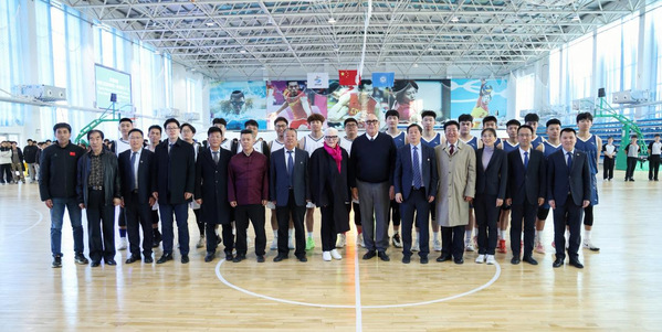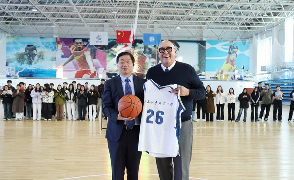 在体育馆,徐东升向伯顿·希普利赠送球衣,伯顿·希普利为比赛用球签字,并为师生篮球赛跳球。