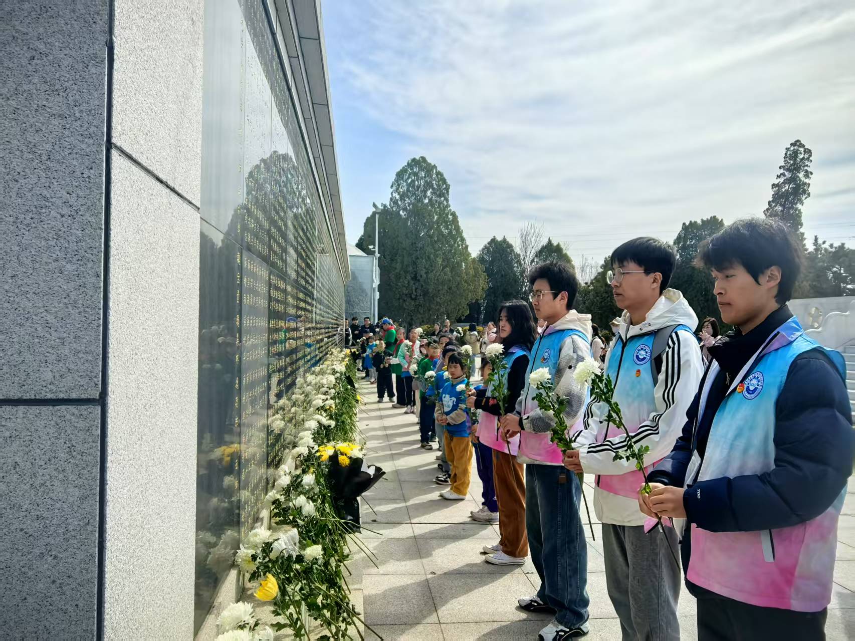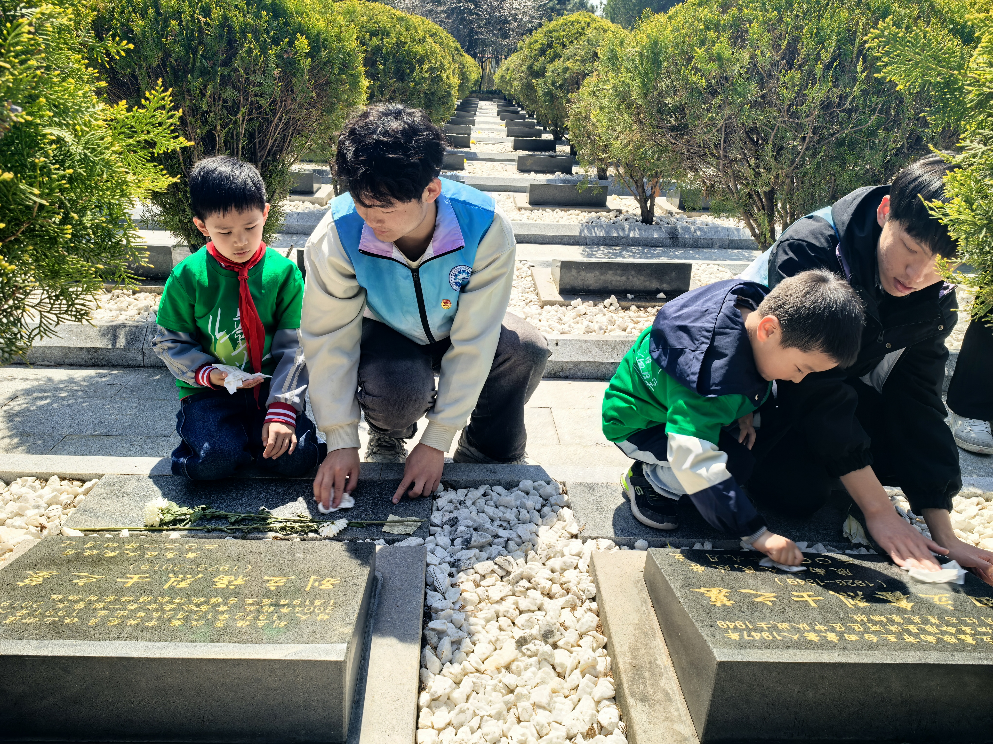 纪念碑前,大学生以《永不褪色的守望》朗诵叩击人心,两代宣讲者共同立下誓言:“做一粒火种,让信仰照亮每个角落!” 00后大学生与10后小学生共同清理烈士墓,擦拭碑文并考证生平,共同向革命烈士献上菊花,书写寄语,将满载崇敬的明信片悬挂于纪念树,完成跨越时空的精神对话。