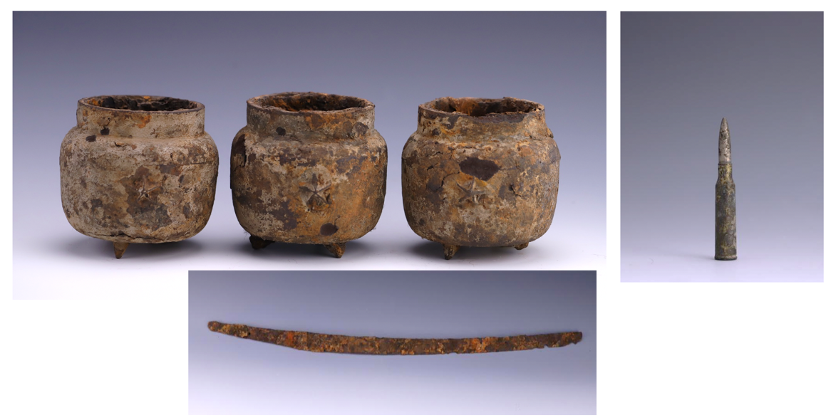 此外,井中出土物中至少有5枚日军制造的尖头步枪子弹。这些子弹底部有3条均匀分布的铆窝,是日本产子弹的特殊标志,常用于日军配备的三八式步枪。出土的军刀仅存刀身,从尺寸上看应当不是指挥刀,而是为日军坦克兵和飞行员打造的缩短版佩刀。
